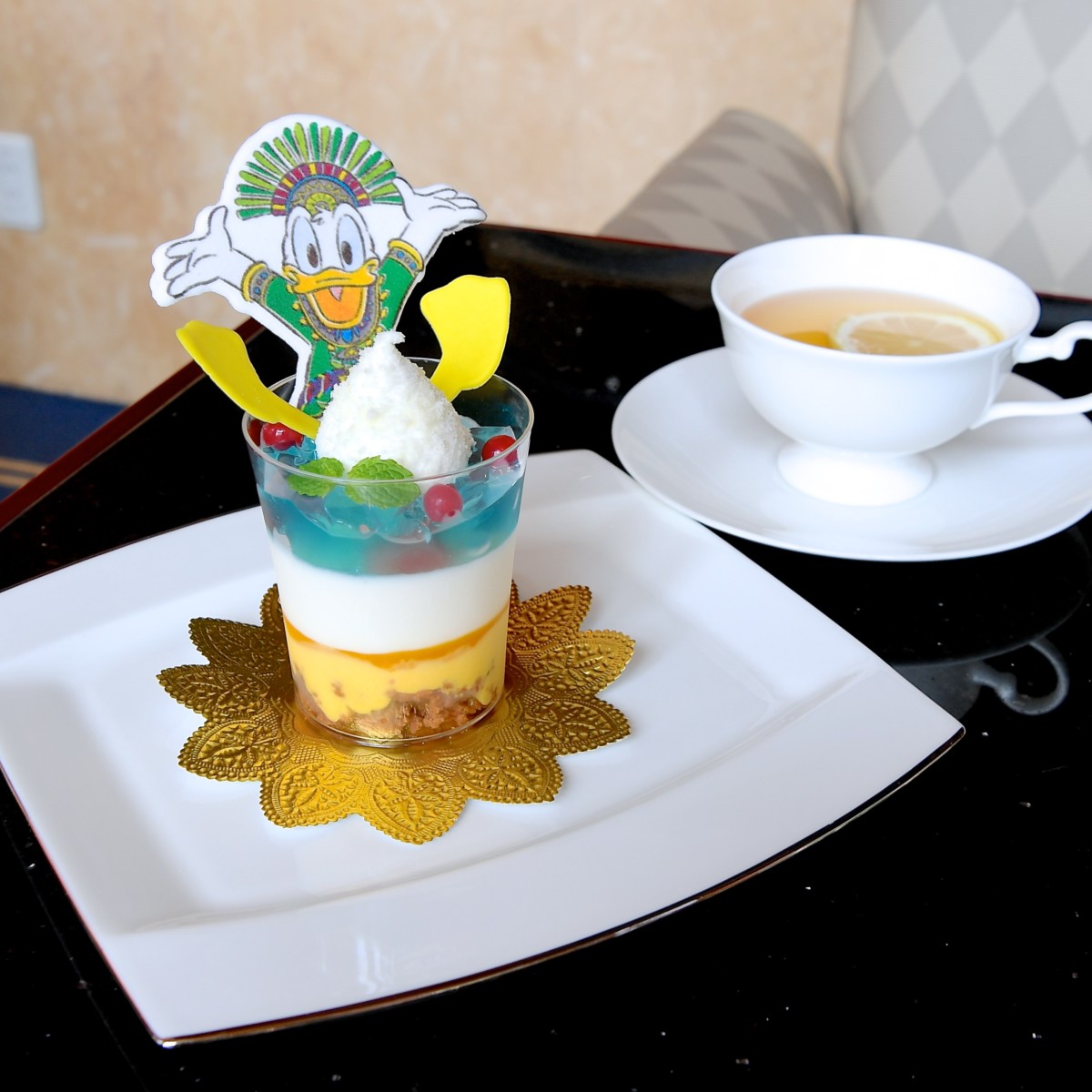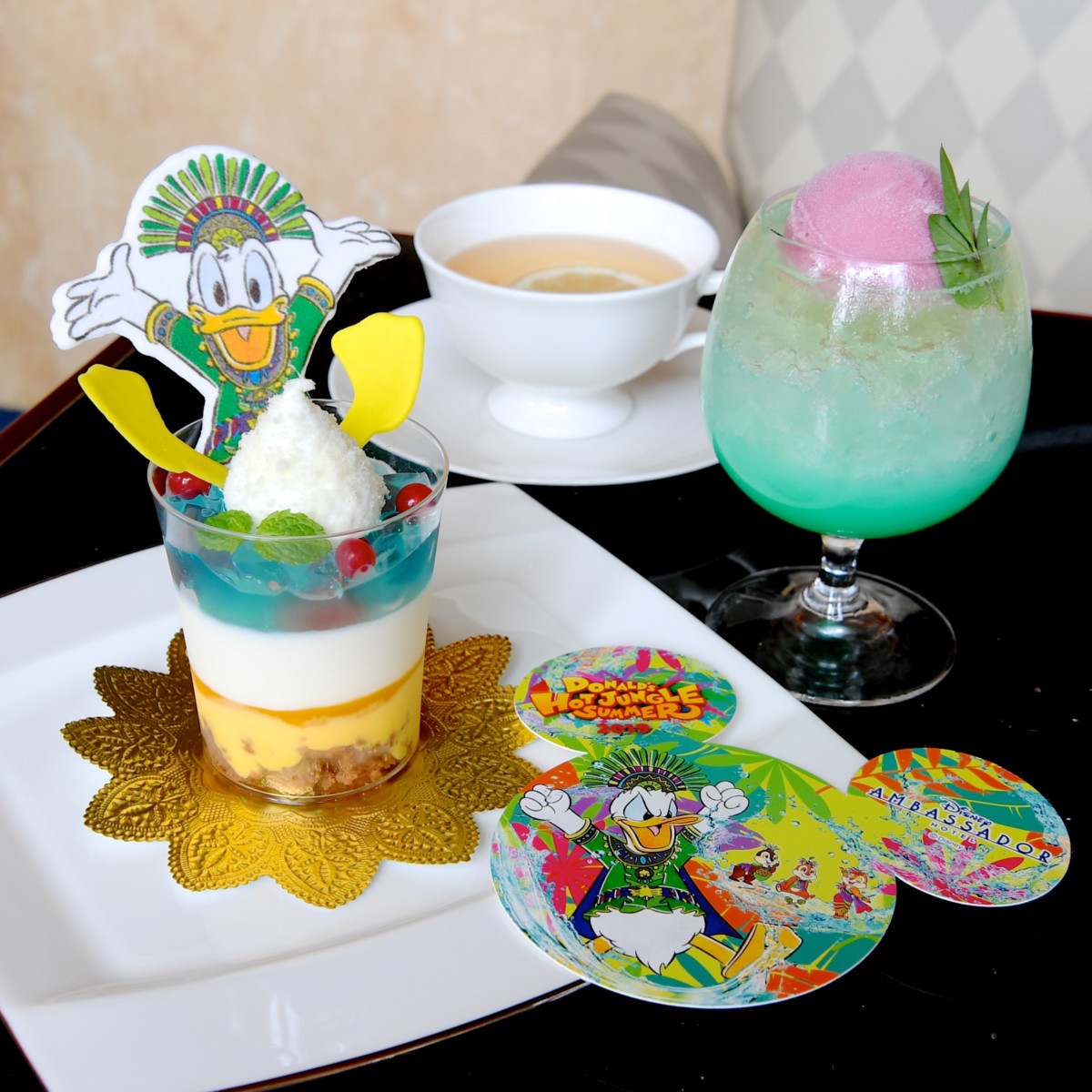 そんな"オー!サマー・バンザイ!”のドナルドをモチーフにしたケーキセットやオリジナルコースター付きスペシャルドリンクがハイピリオン・ラウンジで提供されています。