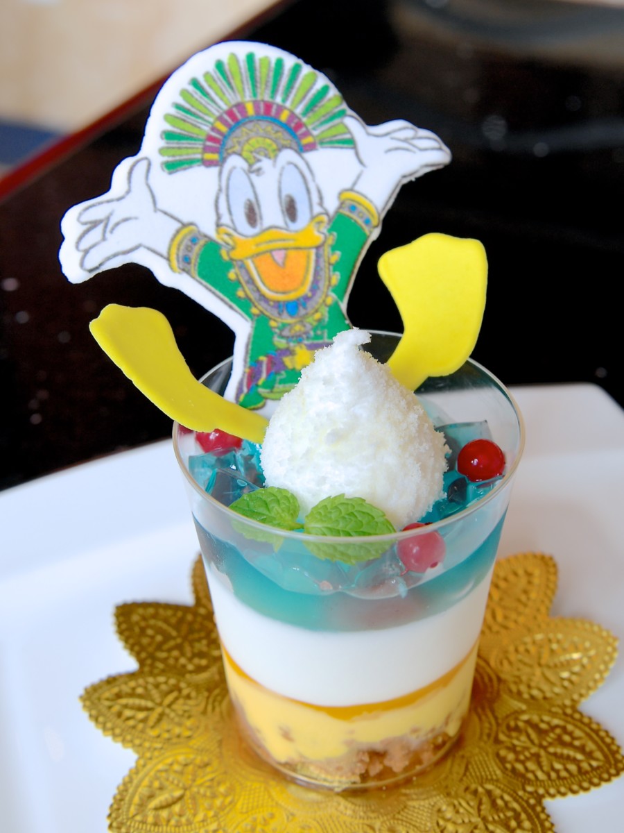 オー!サマー・バンザイ!のドナルドデザインケーキは、下からチョコレートのクランブル、マンゴーのムース、パッションフルーツのソース、グレープフルーツのムース、ブルーゼリーが層になっています。