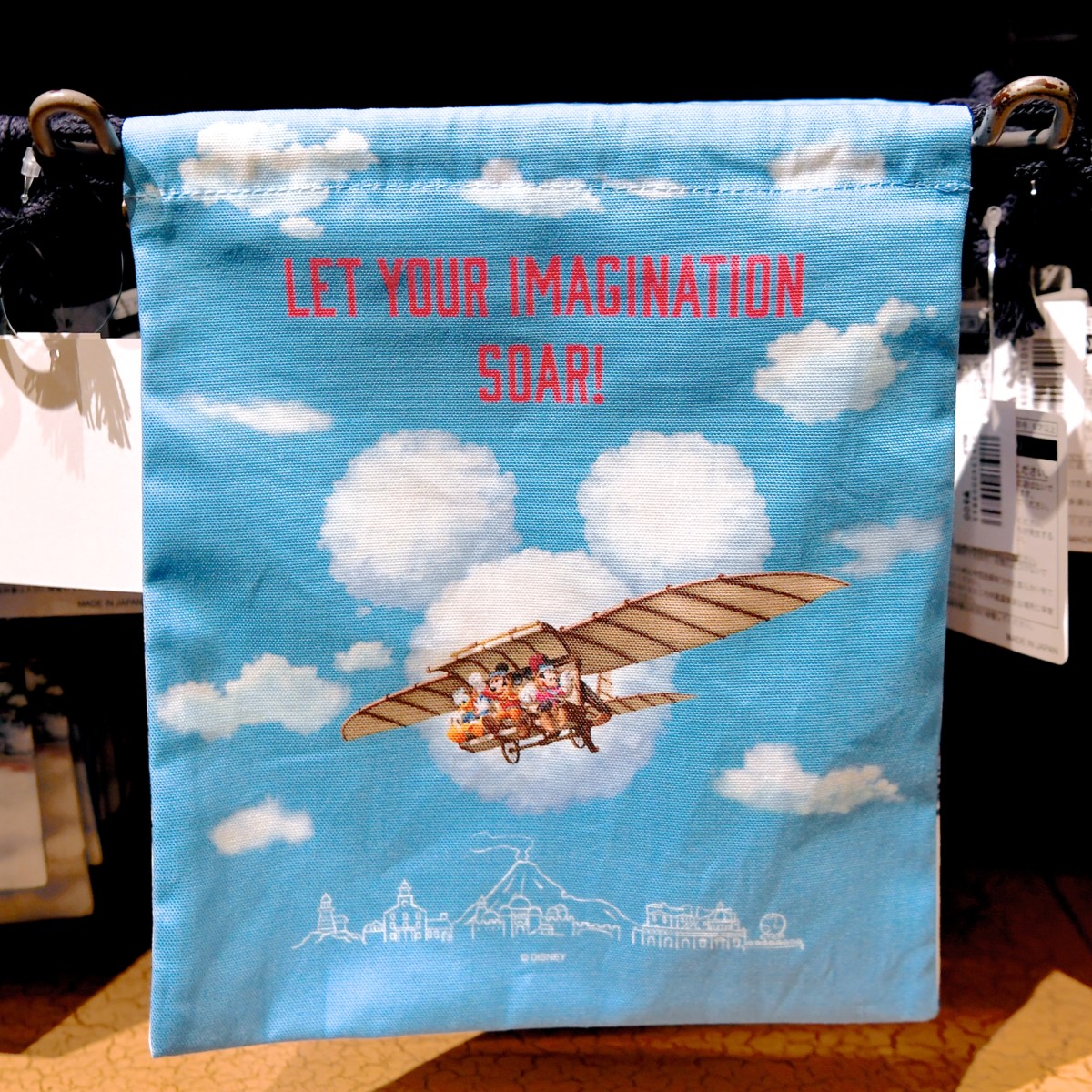 バックデザインはミッキーシェイプの雲をバックにドリームフライヤーに乗ったミッキーたち、LET YOUR IMAGINATION SOAR!