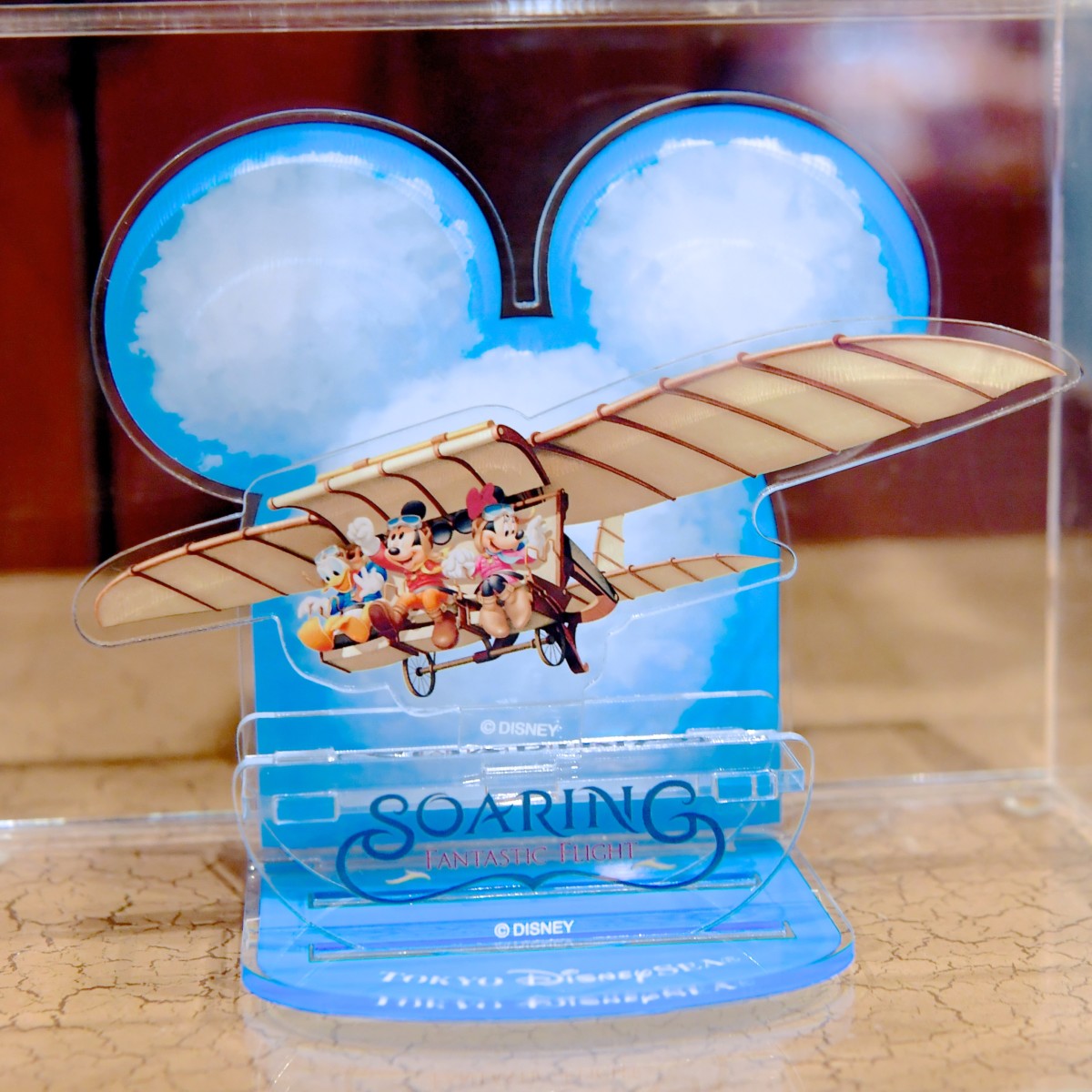 ミッキーシェイプの雲をバックにドリームフライヤーに乗るミッキーたちのアクリルスタンド。