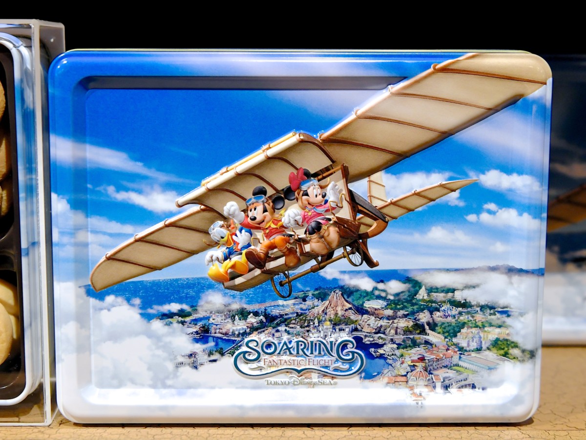 ミッキーたちがドリームフライヤーにのり東京ディズニーシーの上空を飛んでいるメインアートが楽しめる缶入りクッキー詰め合わせ。