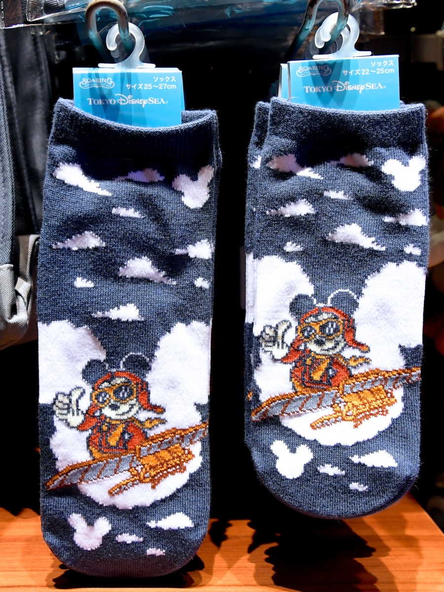 ドリームフライヤー、パイロットミッキー、雲がデザインされた靴下。