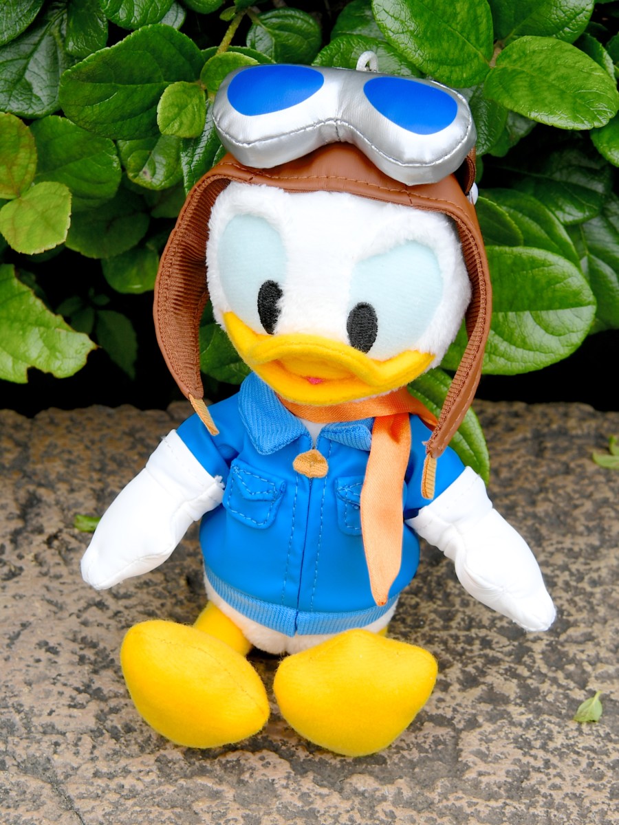 ドナルドはブルーの上着にオレンジ色のバンダナをつけた操縦士コスチューム。