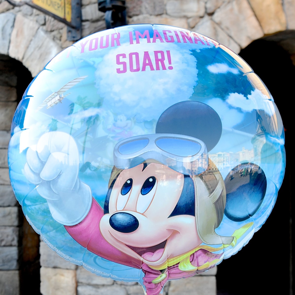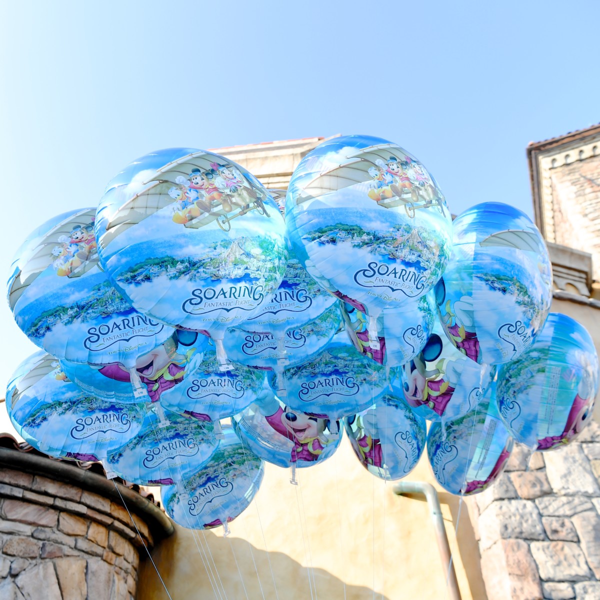 ドリームフライヤーにのって東京ディズニーシー上空を飛んでいるミッキーたちがデザインされたバルーン。