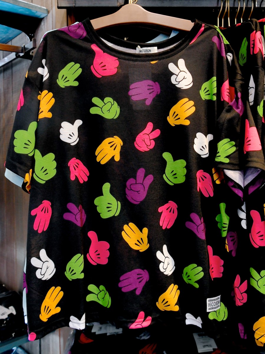 ブラックにピンク、グリーン、パープル、オレンジ、ホワイトカラーのミッキーグローブ総柄Tシャツ。
