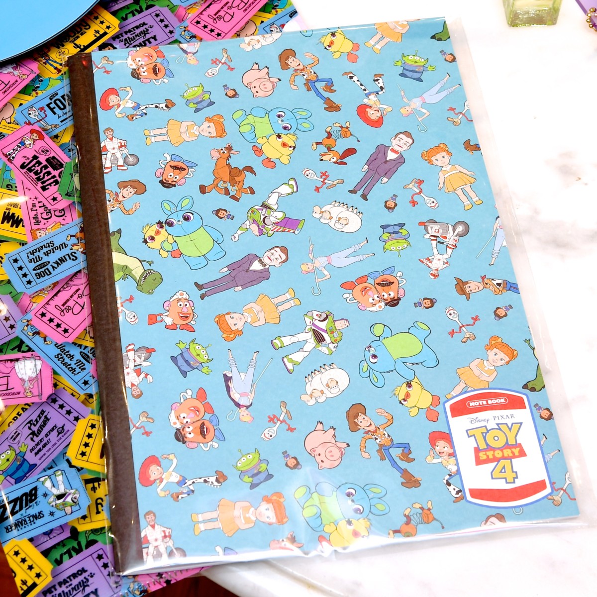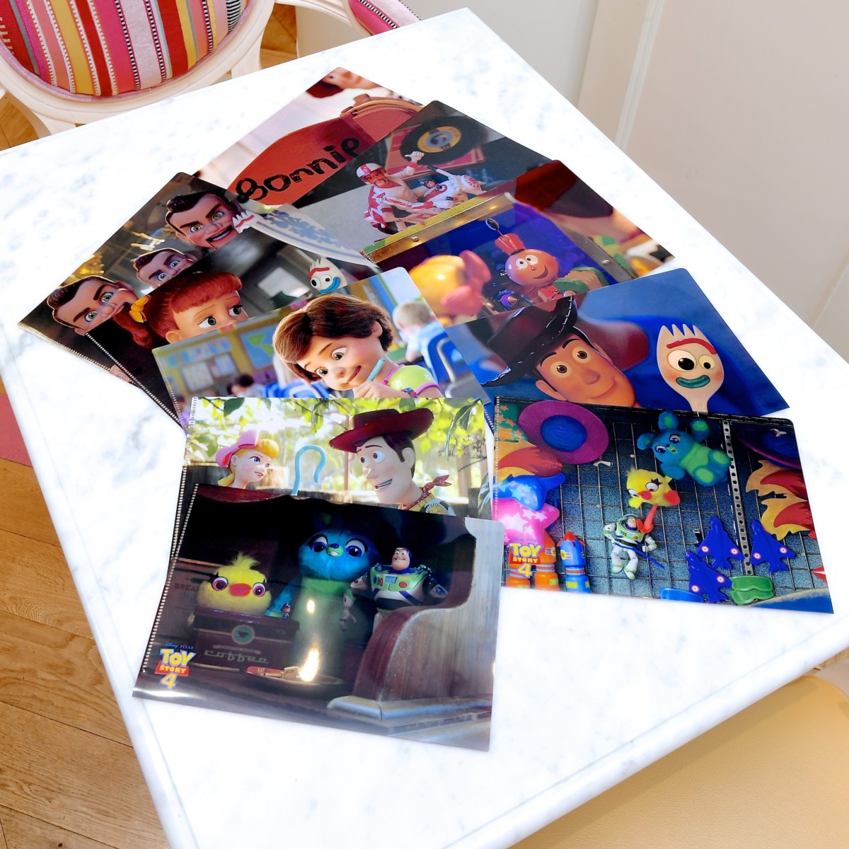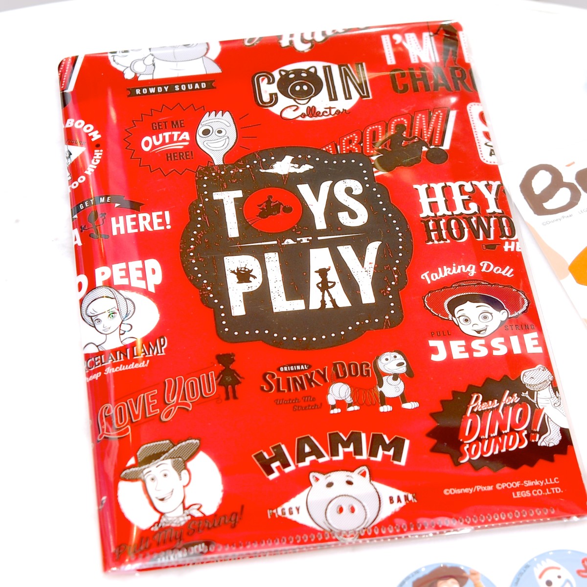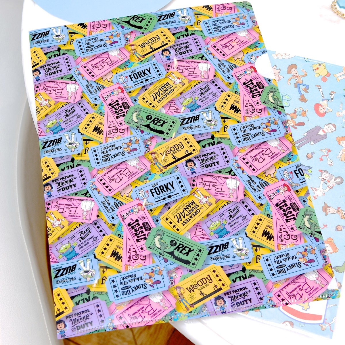 『トイ・ストーリー4』のキャラクターたちがステッカー風にオシャレにデザインされたクリアファイル。