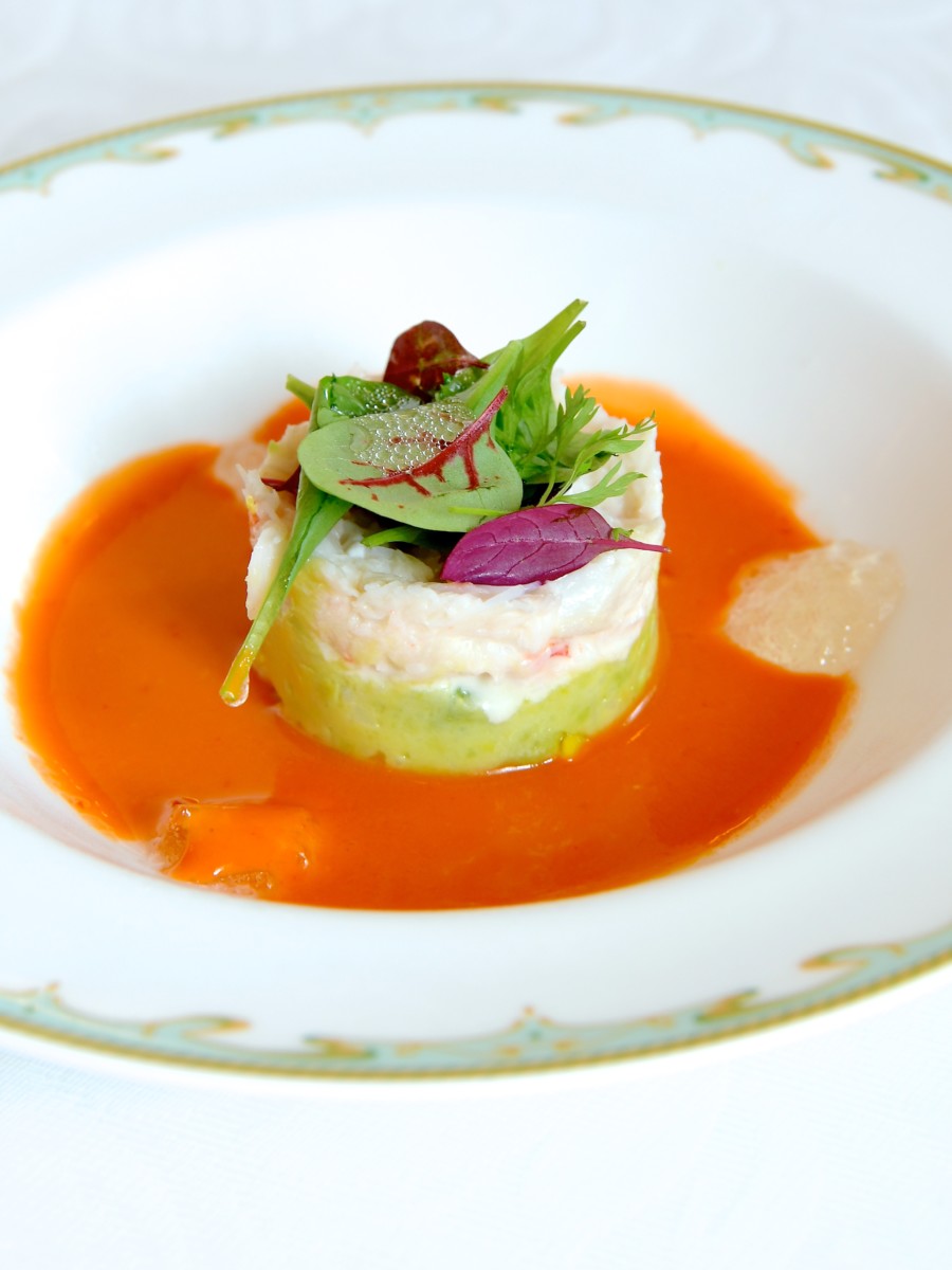 ズワイガニとアボカドのサラダ、ガスパチョ仕立て