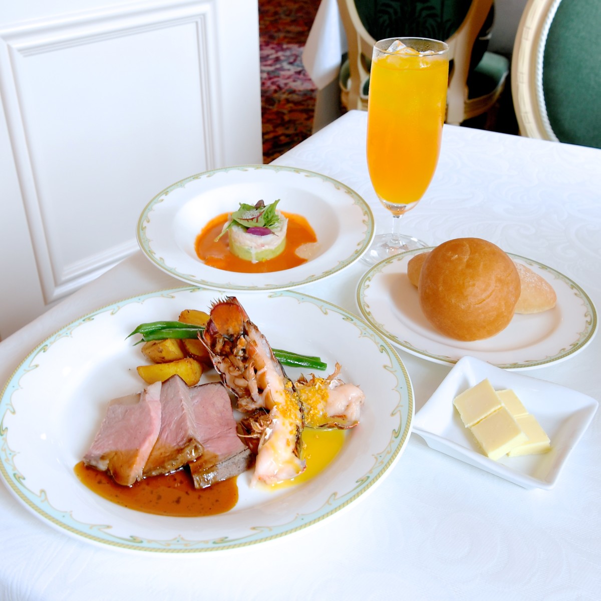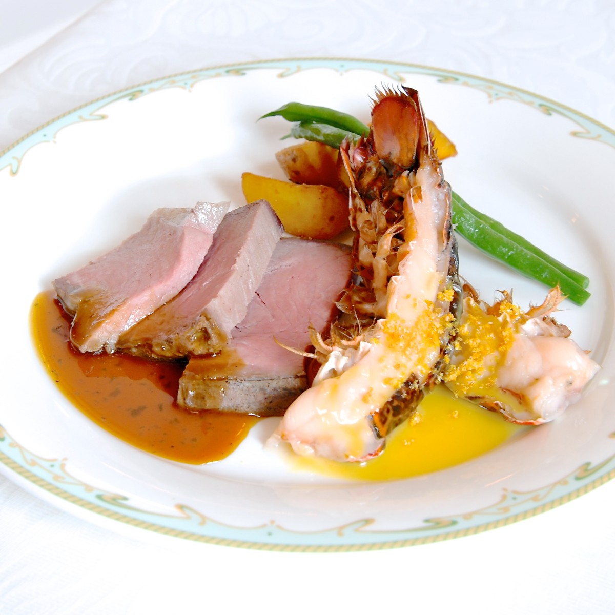 ローストビーフとオマール海老のオーブン焼き、バジル・グレイヴィーソースとマンダリンオレンジのブールブランソース