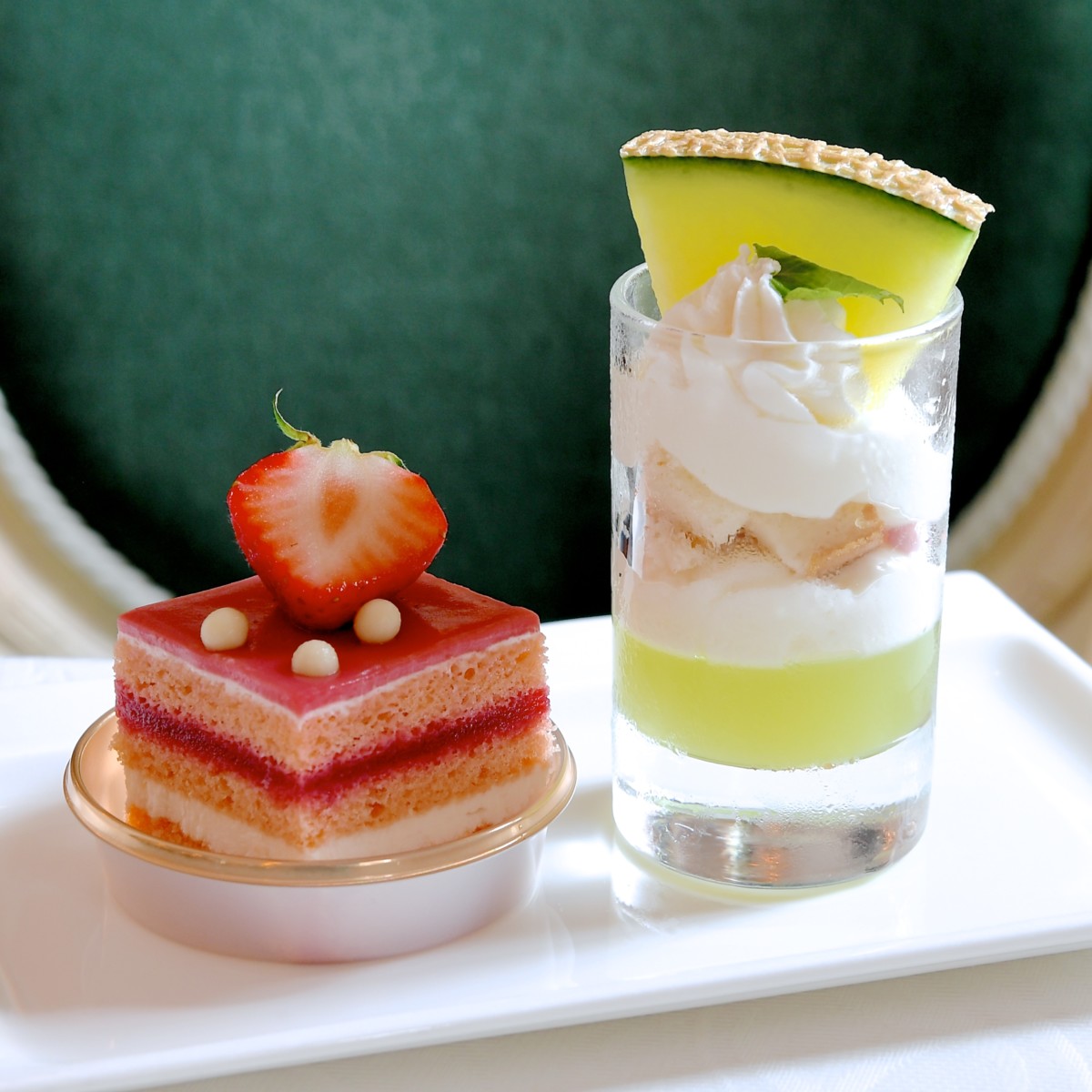 メロンとヨーグルトクリームのヴェリーヌ、ミックスベリーケーキ