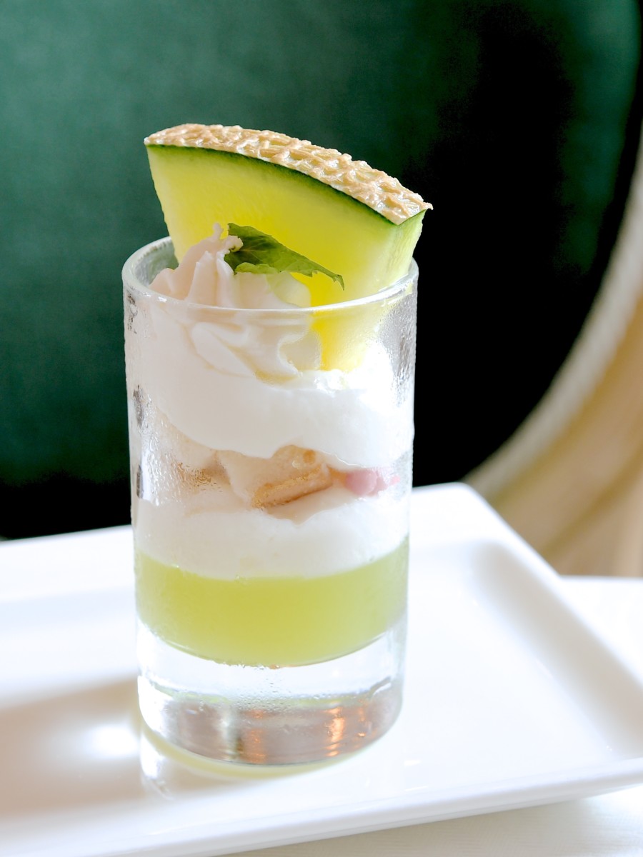 フレッシュなメロンとヨーグルトムース、メロンゼリーのバランスの良いグラスデザートです。