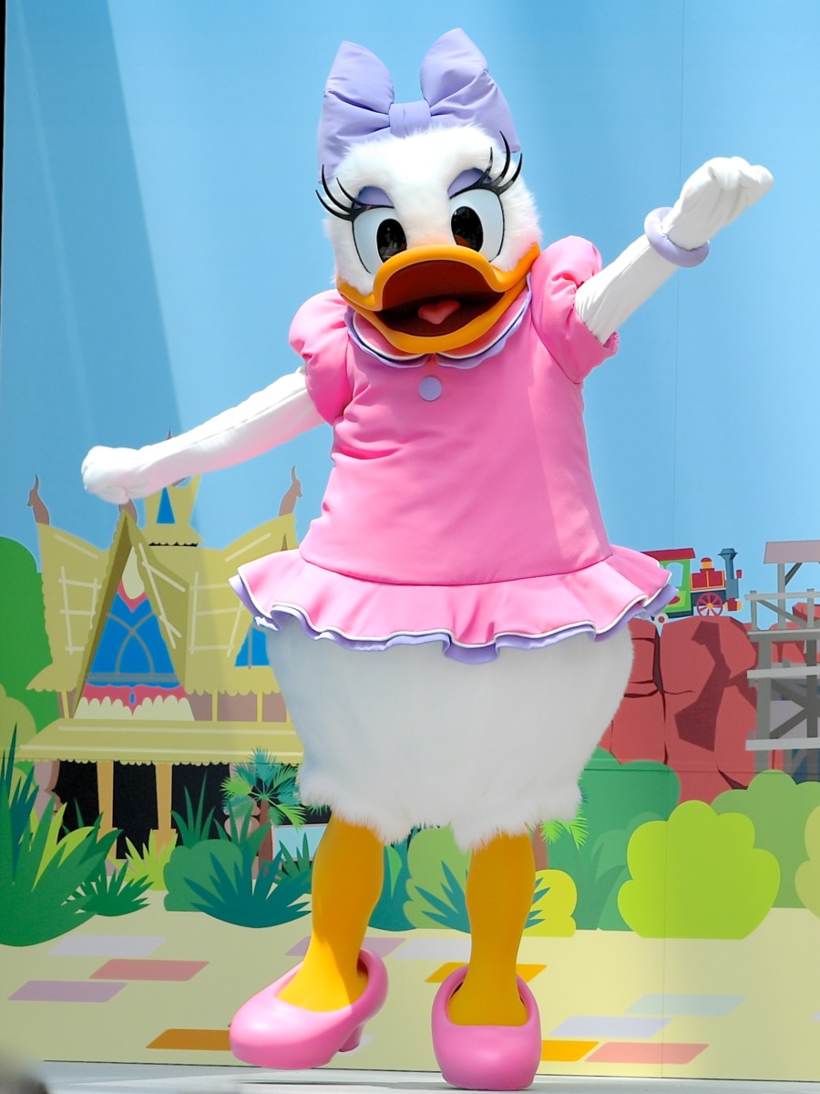 ピンクのワンピース、紫色のリボンがかわいいデイジーダック。