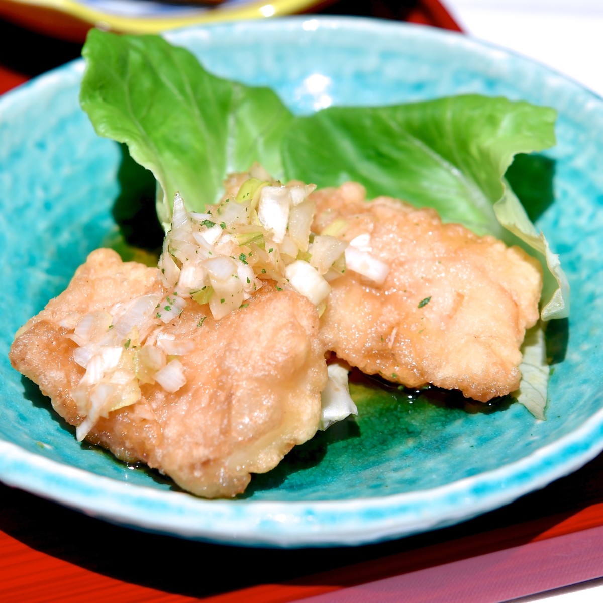 白身魚の唐揚げはネギたっぷりで美味しい香味醤油ソースでいただきます。
