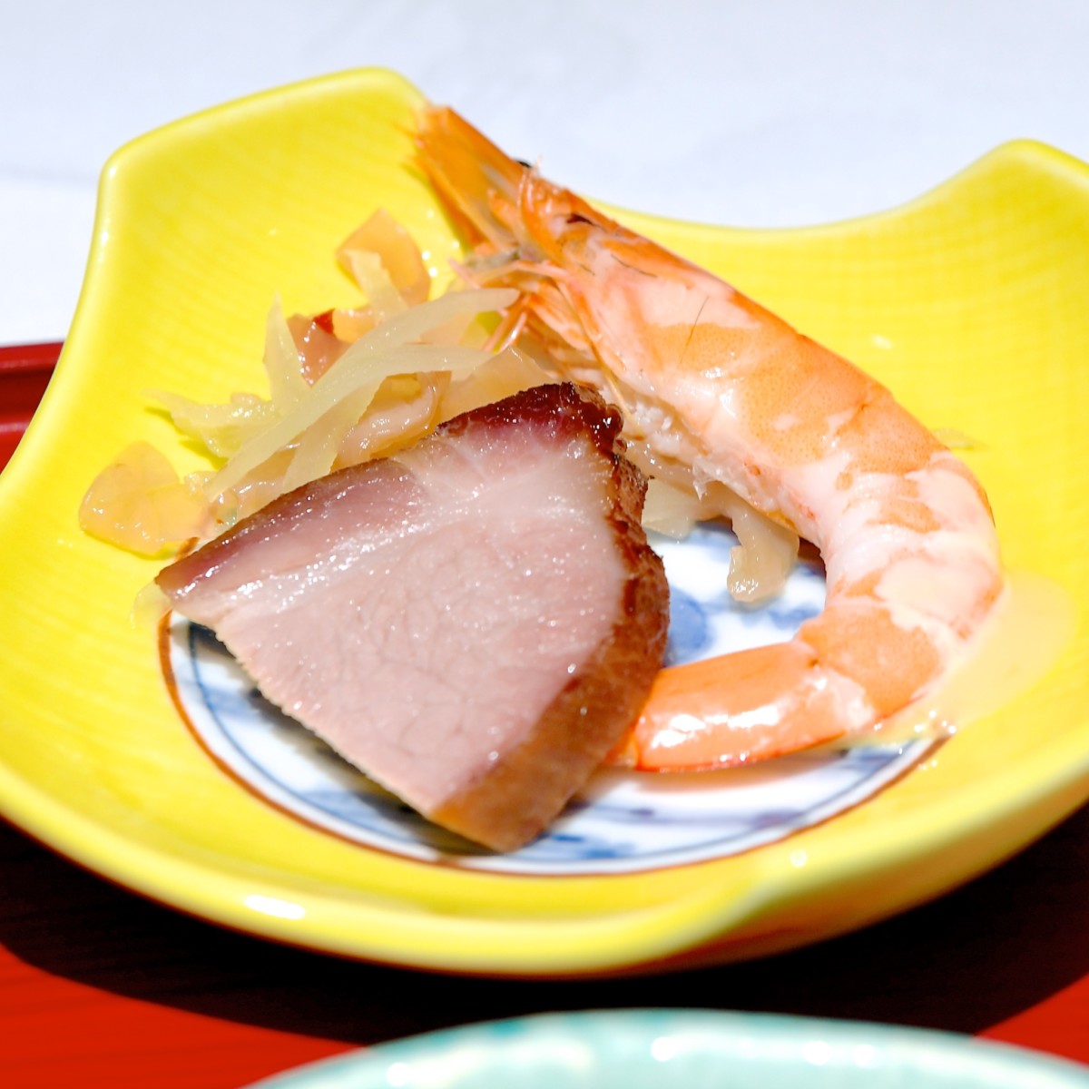 冷菜は海老の湯引き、クラゲ、チャーシューの3種。