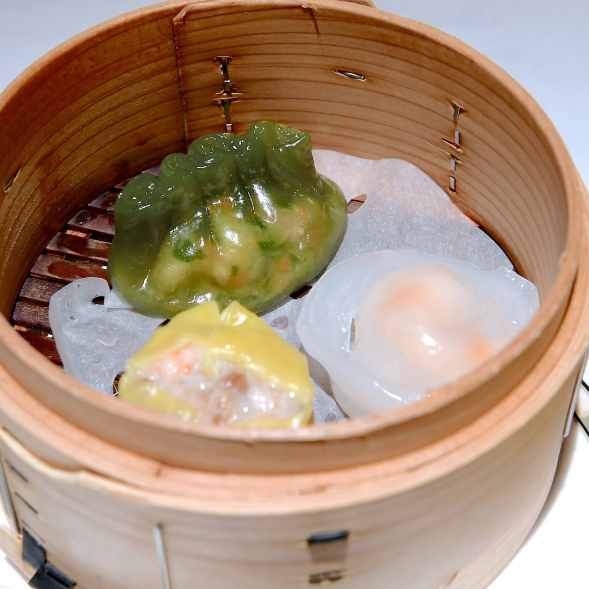 シュウマイとセロリを使った蒸し餃子、ホタテが入った点心3種。