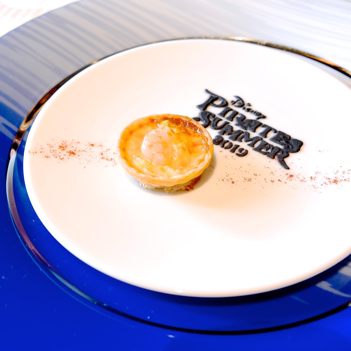 デザートは"ディズニー・パイレーツ・サマー2019"のロゴと海賊のバンダナをイメージしたパートブリックが格好いい盛り付け。