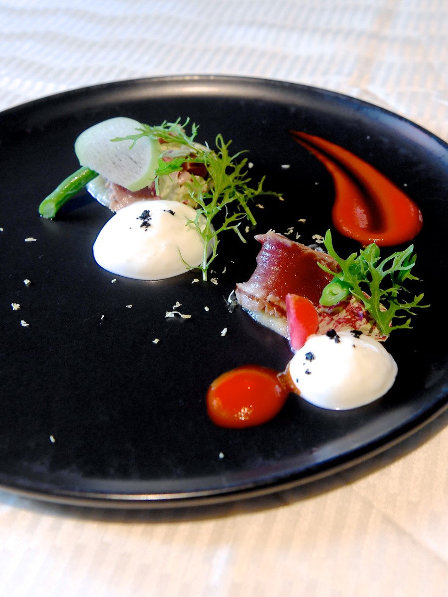 ■マグロのレアグリル 茄子のクーリとヨーグルトのエスプーマ
