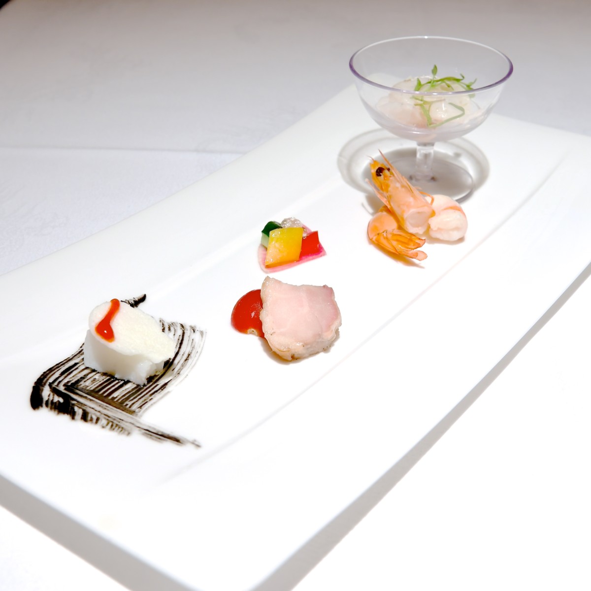 タコと長芋のわさび和え、海老の湯引き、宝箱をイメージしたパプリカときゅうりのマリネ、鶏肉、黒ごまのソースで描かれた旗にドクロをイメージしたイカの寄せ物の前菜です。