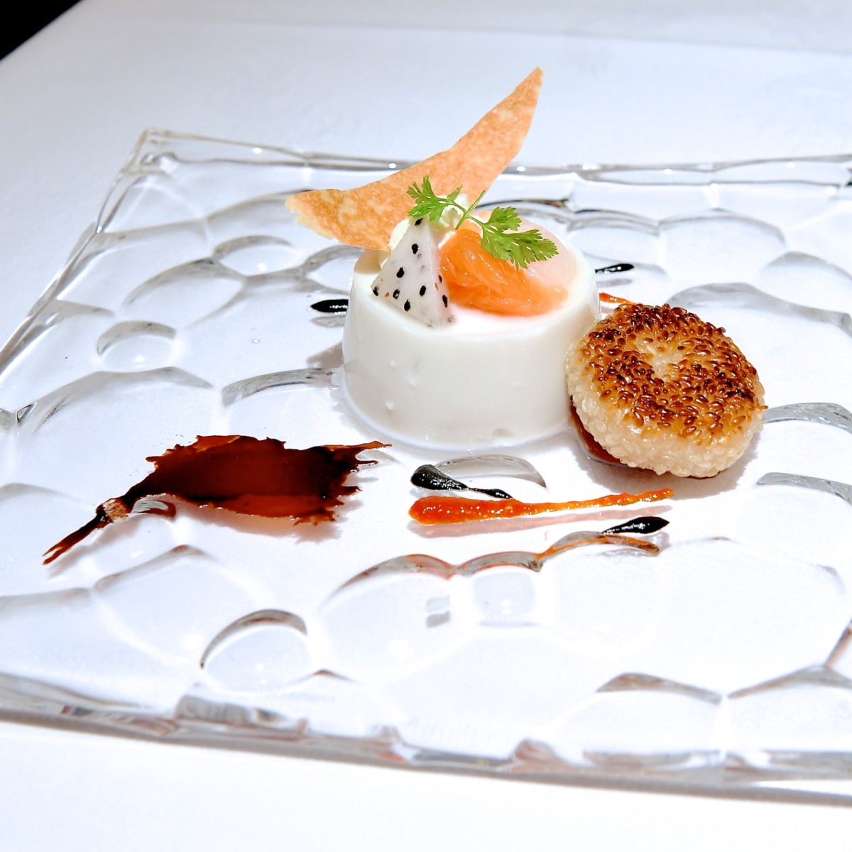 ココナッツプリン 黒胡麻ソースと焼き胡麻餅添え