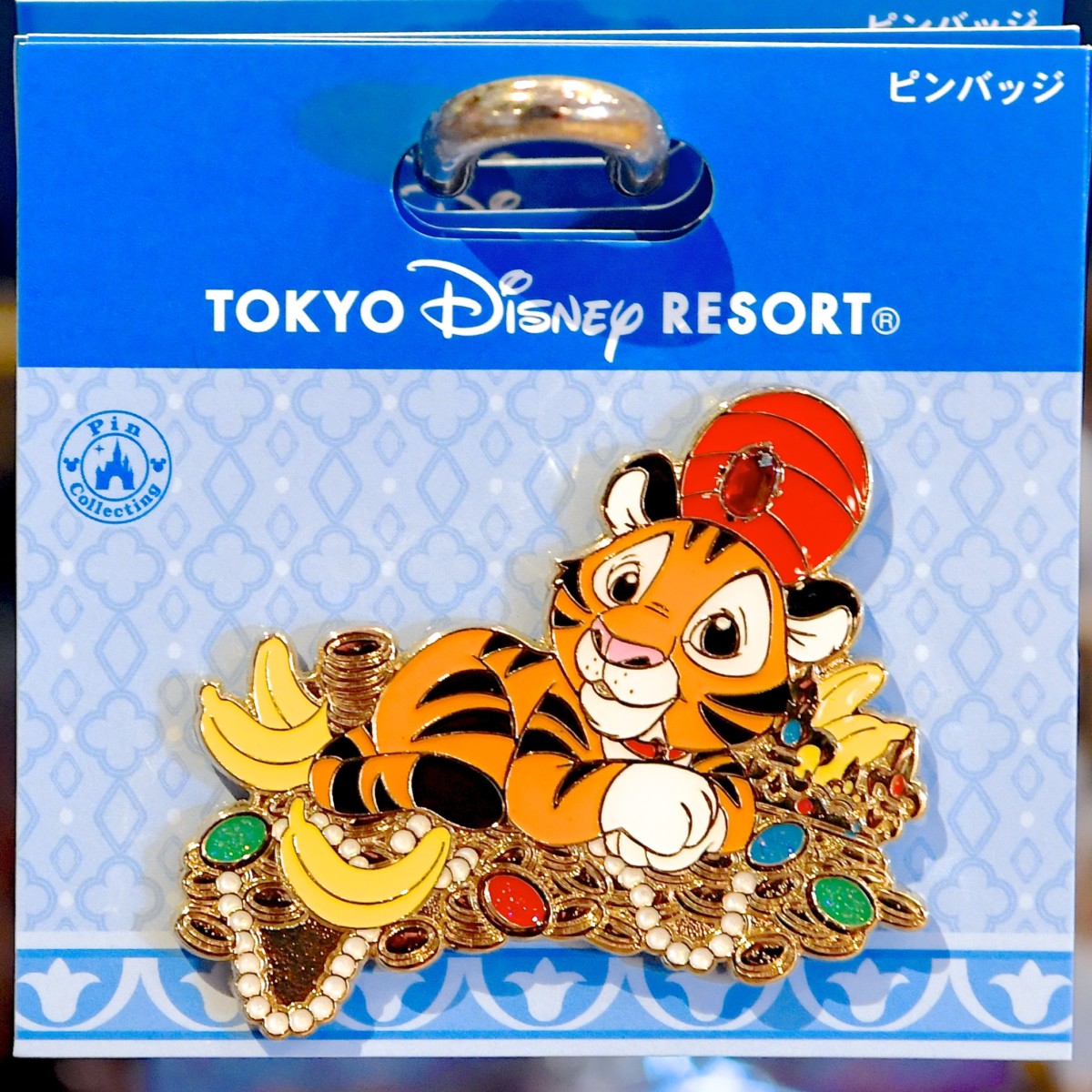 宝石やバナナに囲まれたチャンドゥの大きめピンバッジ。