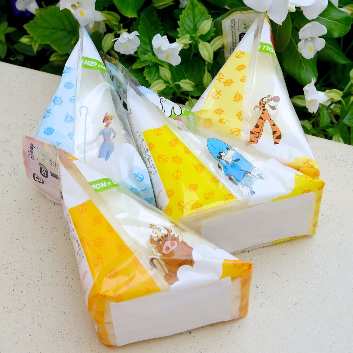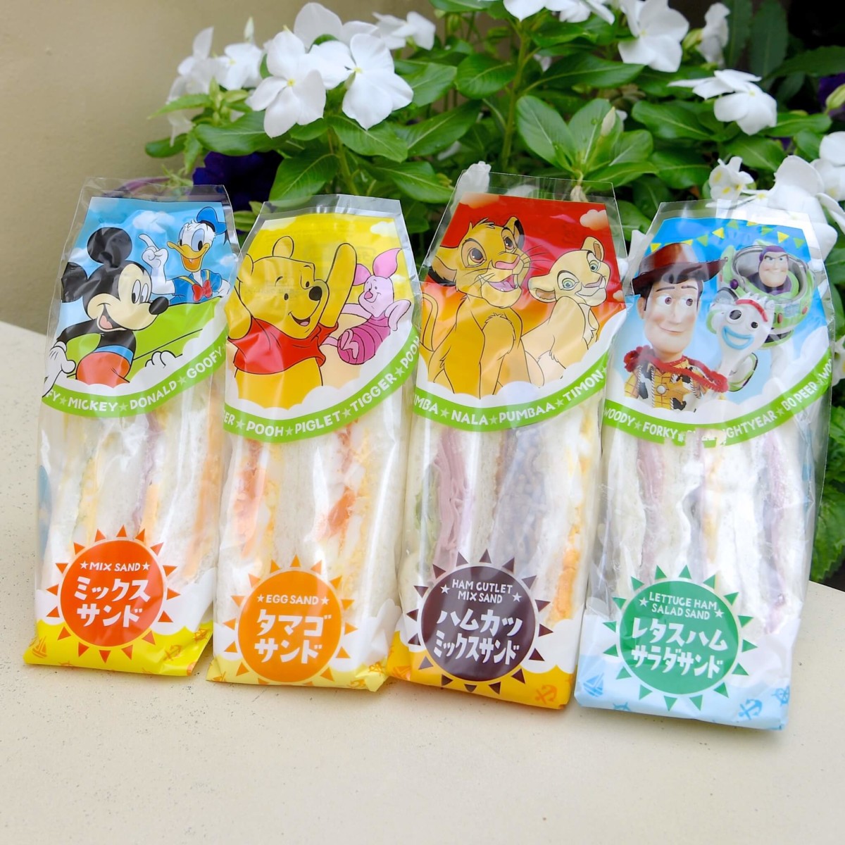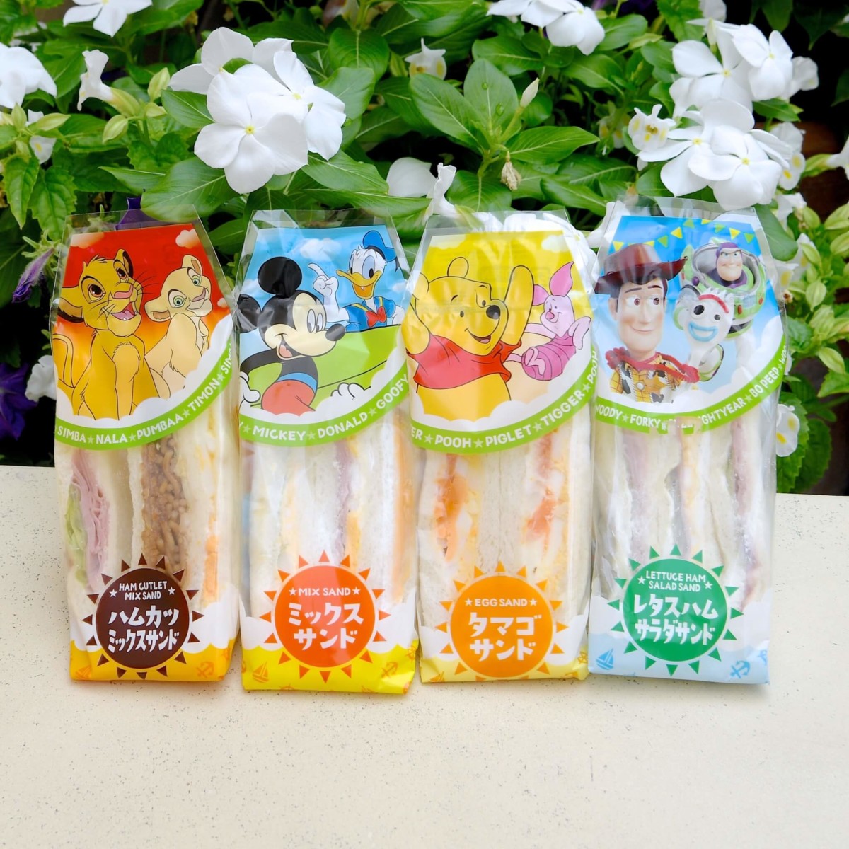 ミッキー&ドナルドがデザインされたミックスサンド、プーさん&ピグレットがデザインされたタマゴサンド、シンバ&ナラがデザインされたハムカツミックスサンド、ウッディ&バズがデザインされたレタスハムサラダサンドの4種類が販売中です。