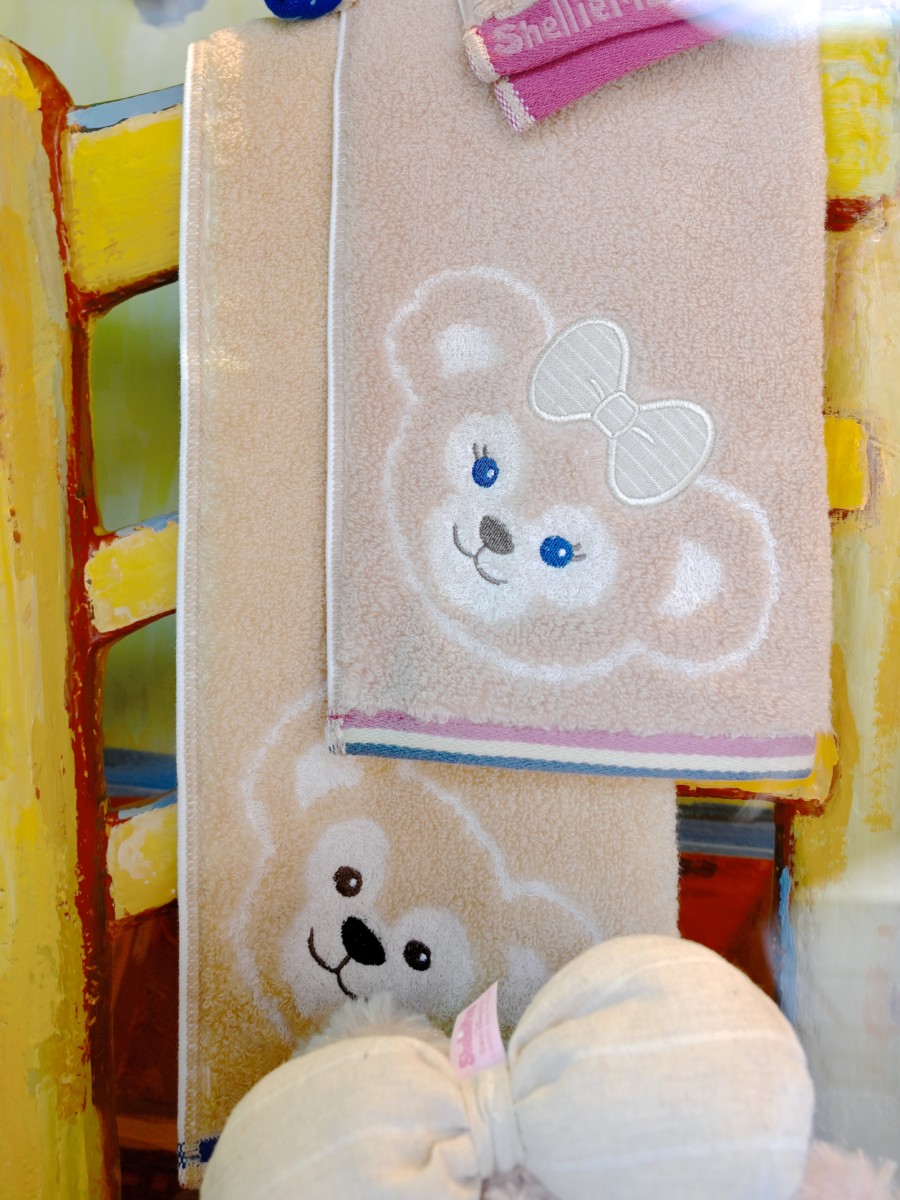 ダッフィー、シェリーメイ、ジェラトーニ、ステラ・ルーがデザインされたバスタオル。