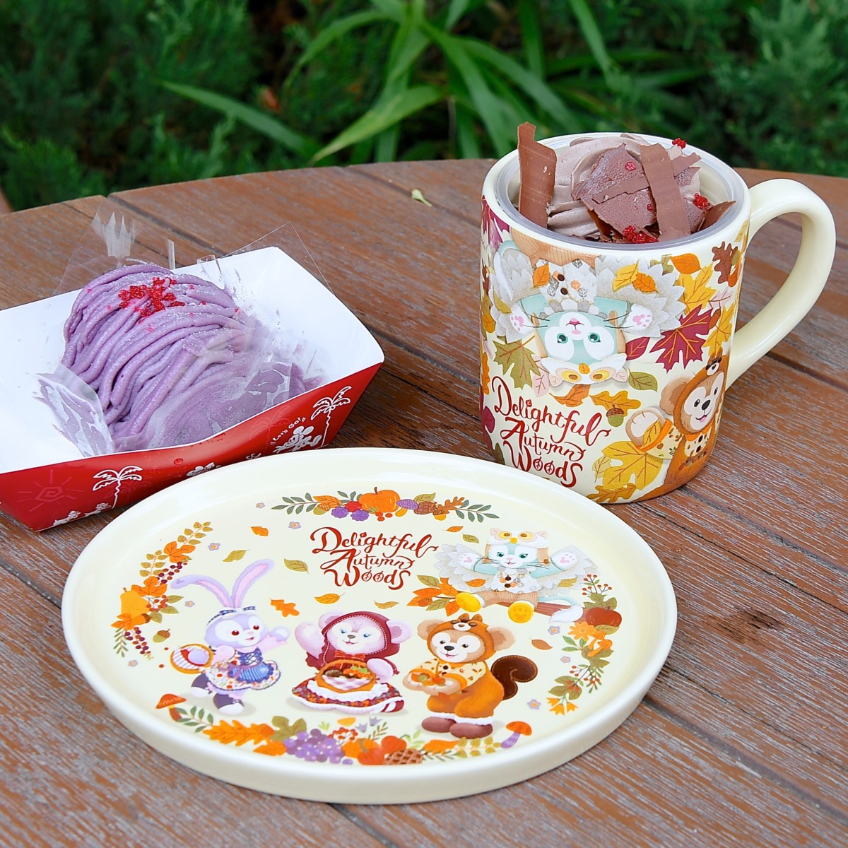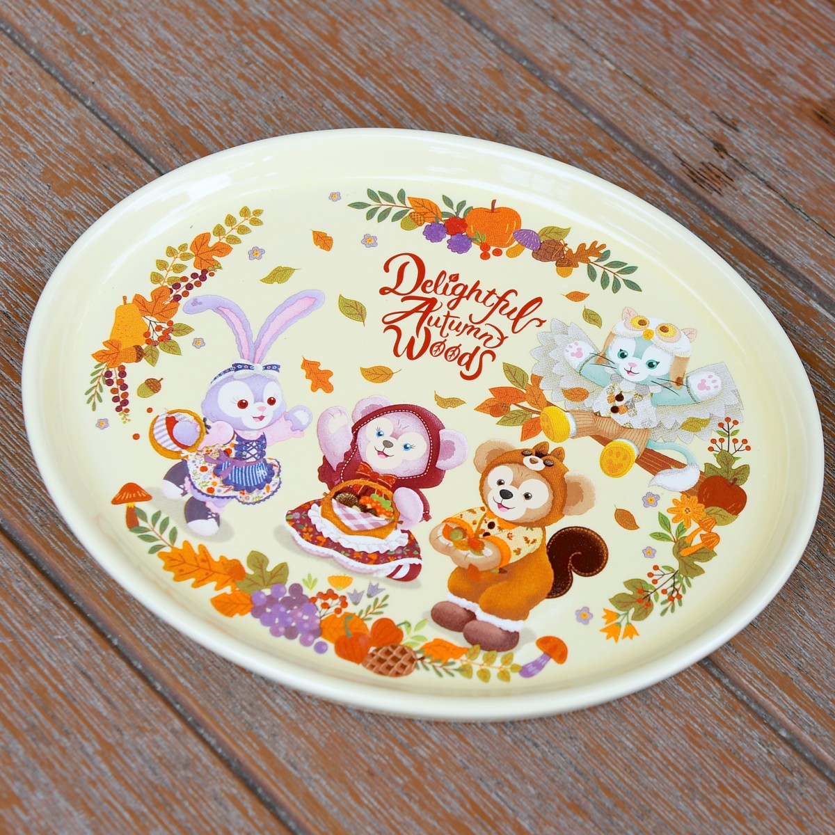 プレートには木のみを集めたダッフィー、シェリーメイ、ステラ・ルーと木の上でフクロウになりきっているかわいいジェラトーニがデザインされています。