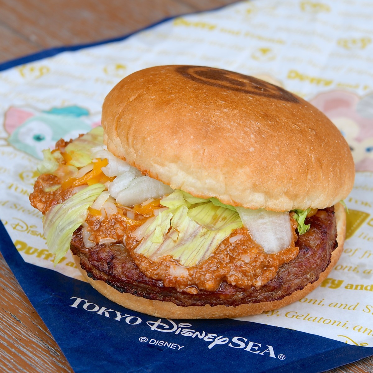 ダッフィーの焼印がデザインされたスペシャルバーガー(ミートソース&チーズのハンバーガー)