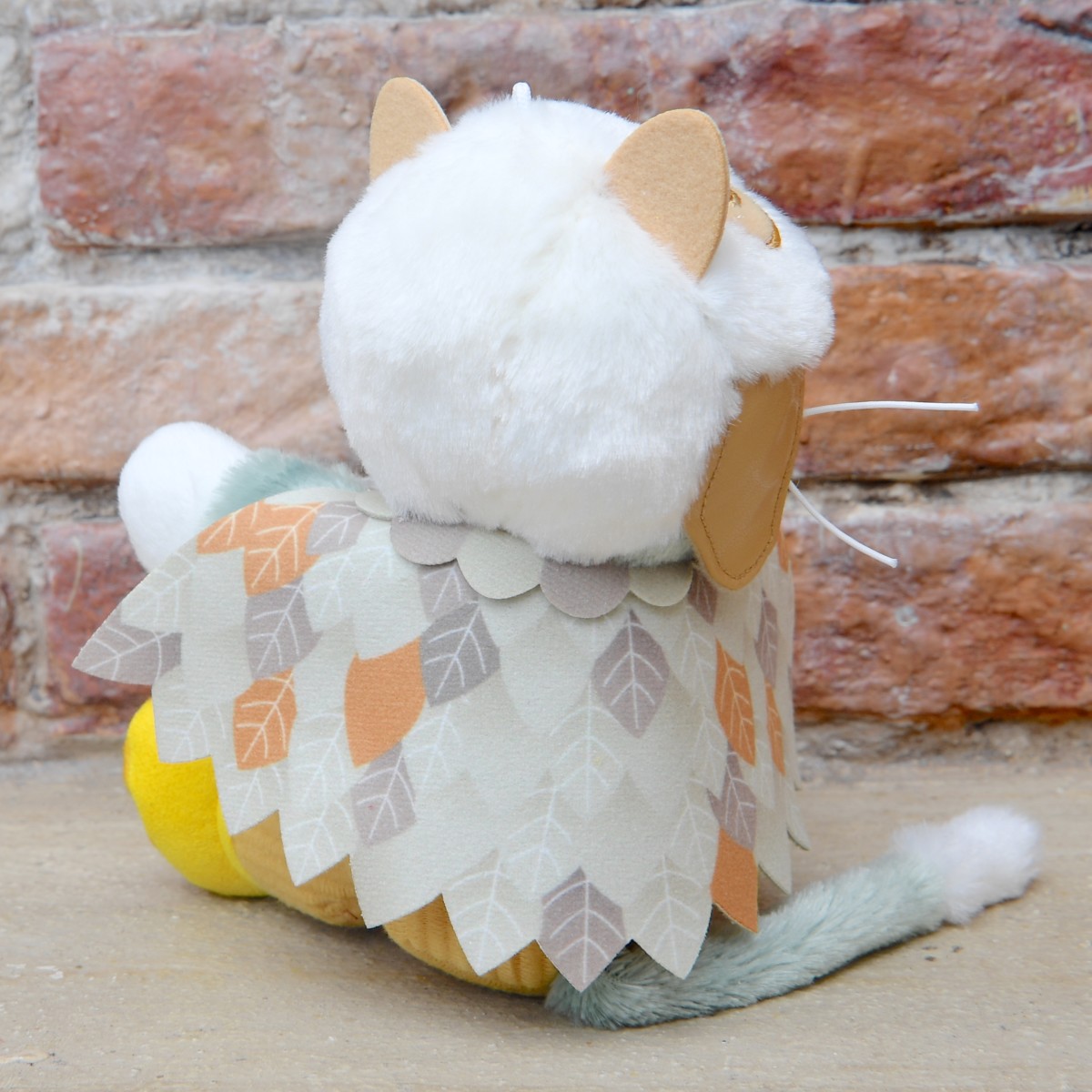 秋らしい色合いでフクロウに仮装している「ジェラトーニ」のぬいぐるみ。