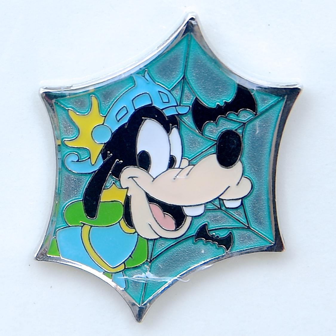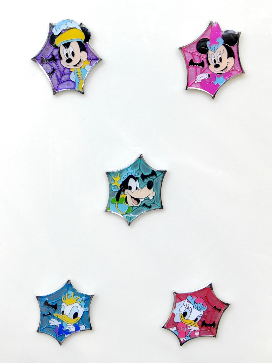ピンは「フェスティバル・オブ・ミスティーク」コスチュームのミッキー、ミニー、ドナルド、デイジー、グーフィーの蜘蛛の巣シェイプデザインがハロウィーンらしい5種類。