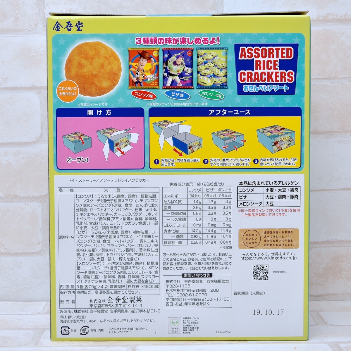 コンソメ味に加え、「トイ・ストーリー」シリーズならではの、ピザ味、クリームソーダ味も楽しめるおせんべいの詰め合わせです。