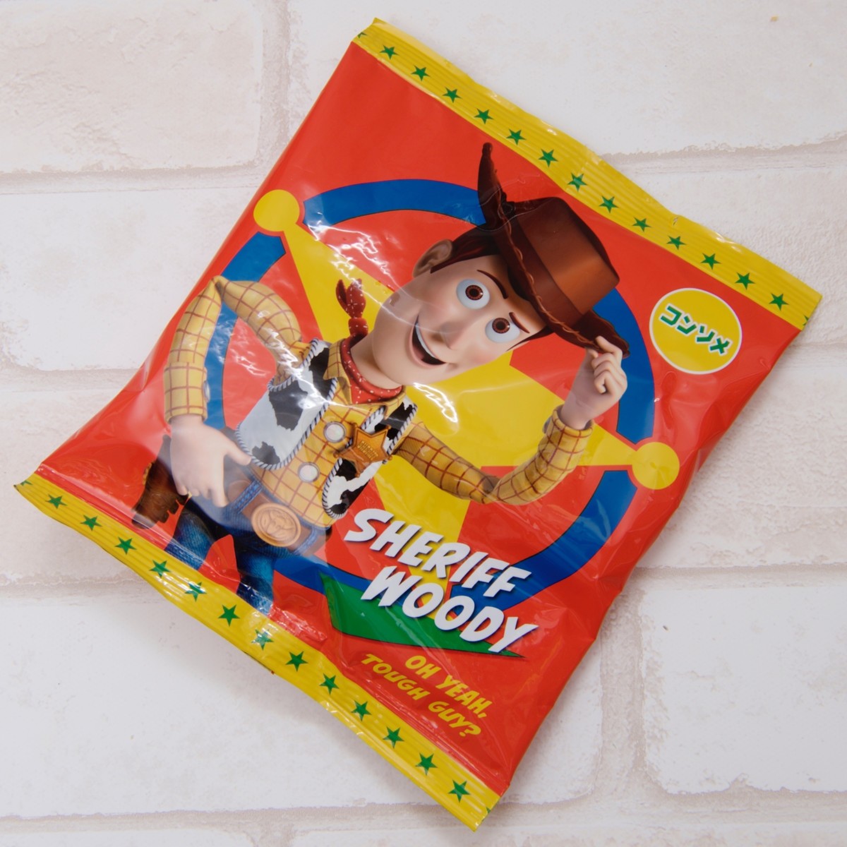 コンソメ味は真っ赤なパッケージに主人公「ウッディ」が描かれています。
