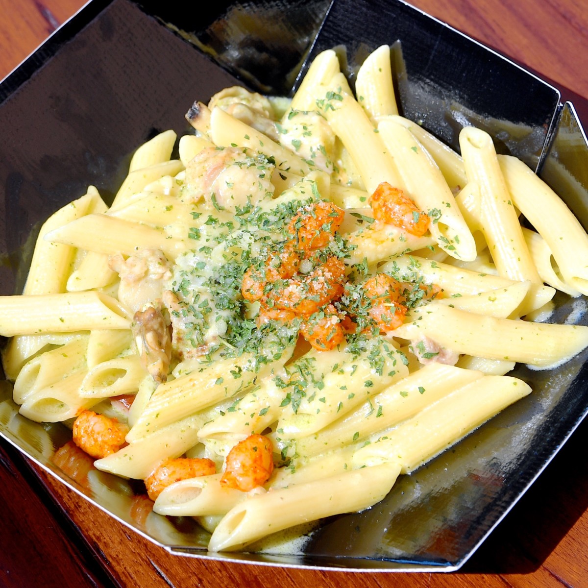 初のシェフのおすすめパスタは「ペンネ、シーフードのバジルクリームソース」