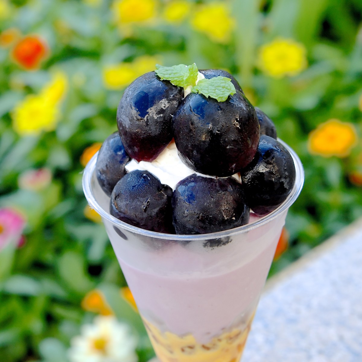 たっぷりの生クリームに巨峰、ミントがトッピングされたスペシャルパフェ!