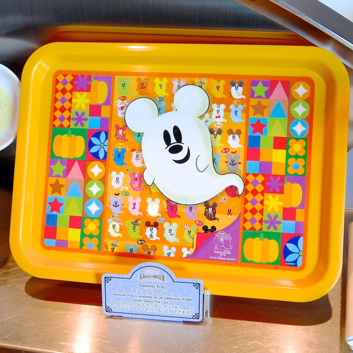 仮装してパークを楽しむミッキーおばけがデザインされたカラフルなトレーです。