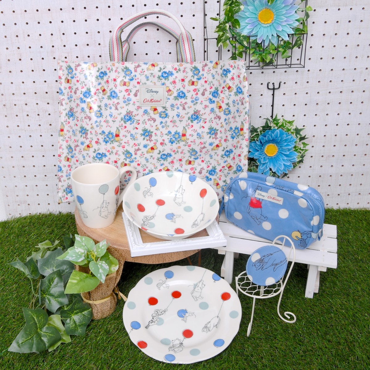 全18点のラインナップのうち「ブレイムリースプリグフレンズ」デザインのトートバッグ、テーブルウエア、「バルーンボタンスポット」デザインのポーチを紹介します。