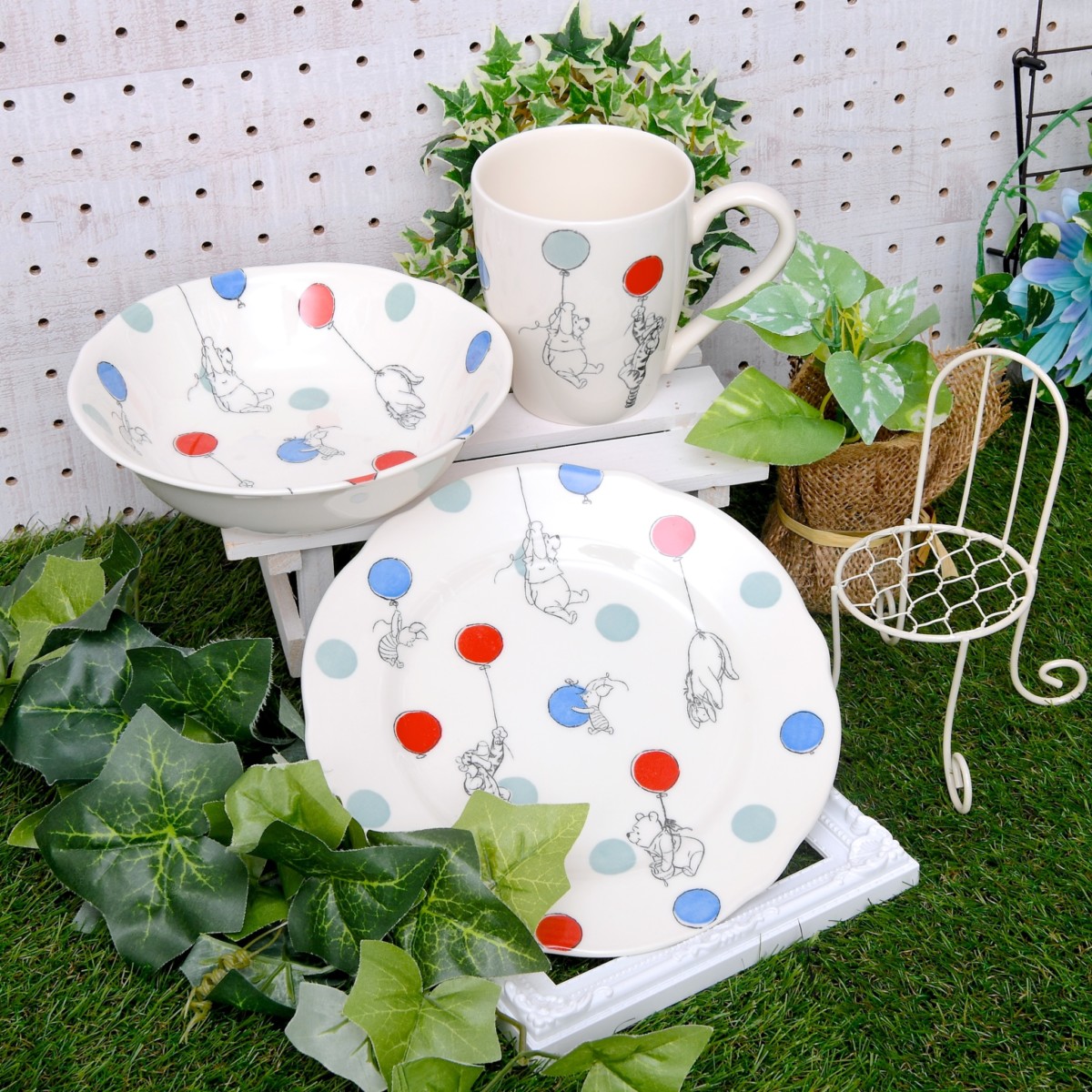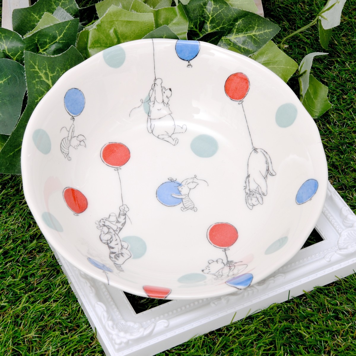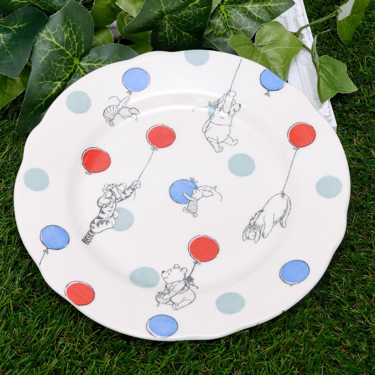 風船でふわふわ浮かぶくまのプーさん、ピグレット、イーヨー、ティガーがデザインされた使い勝手の良いサイドプレート。