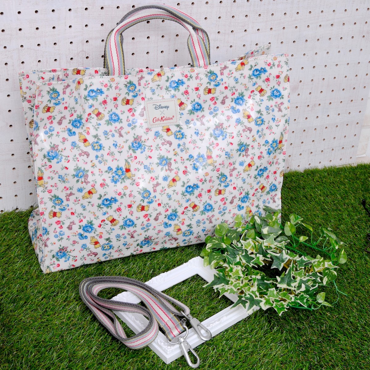 色鮮やかな小花プリントとお花畑で遊ぶくまのプーさんと親友のピグレットがかわいらしいデザインのトートバッグ。