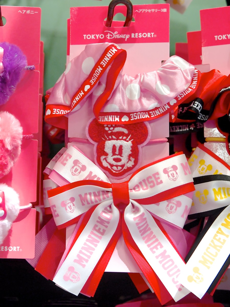 ミニーのヘアゴムセットはかわいいピンクとレッドデザイン。