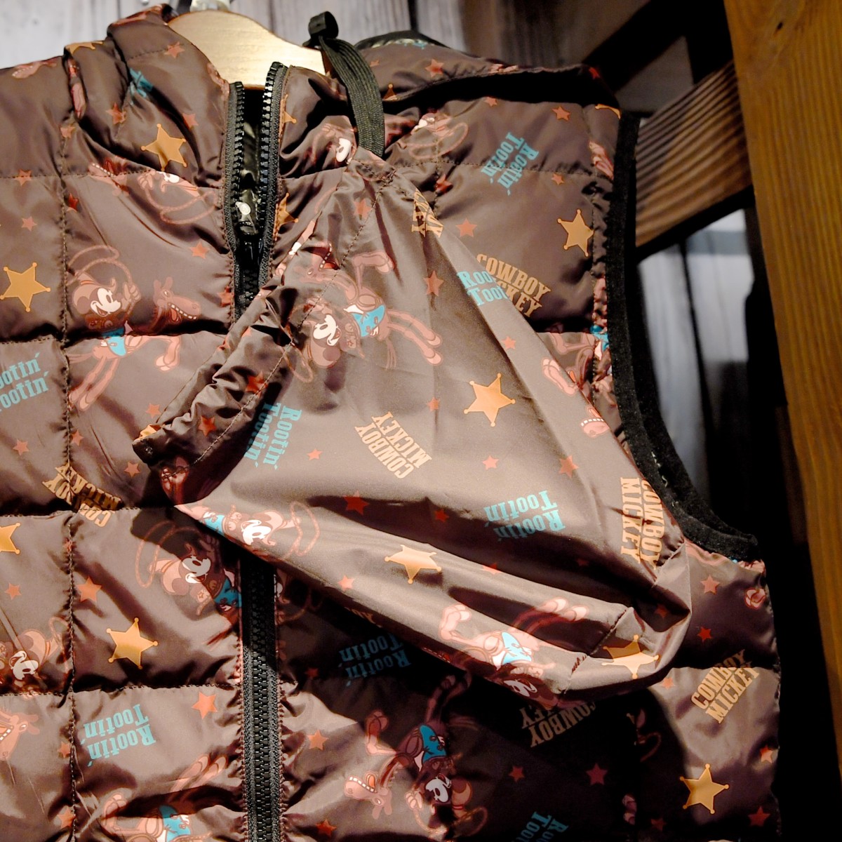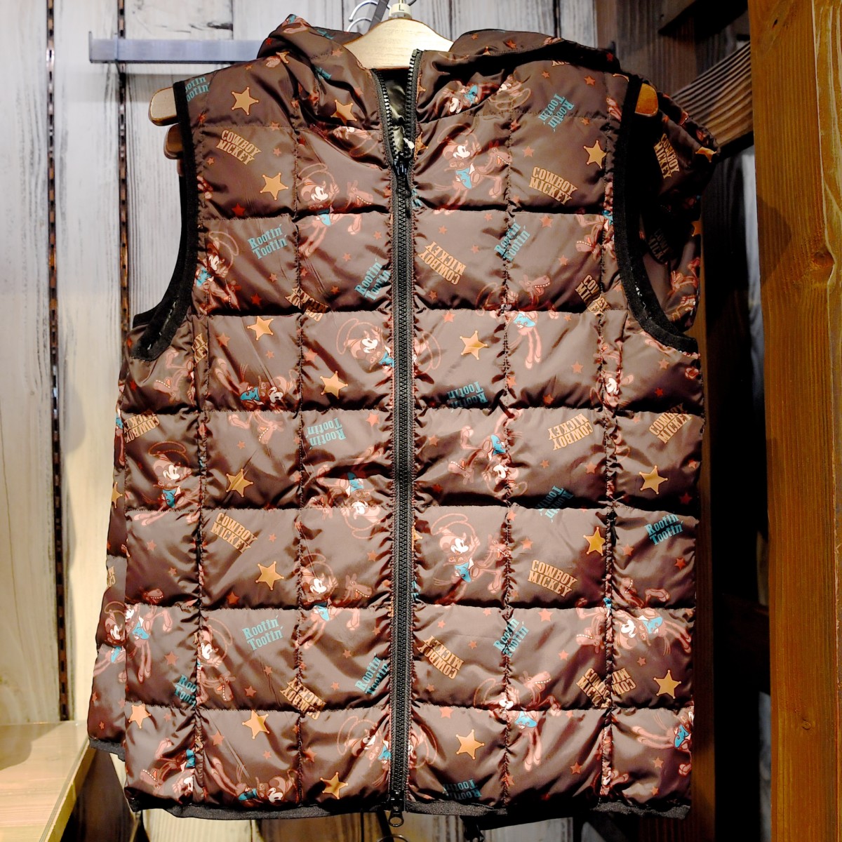 カウボーイ姿のミッキーがデザインされたダウンベスト。