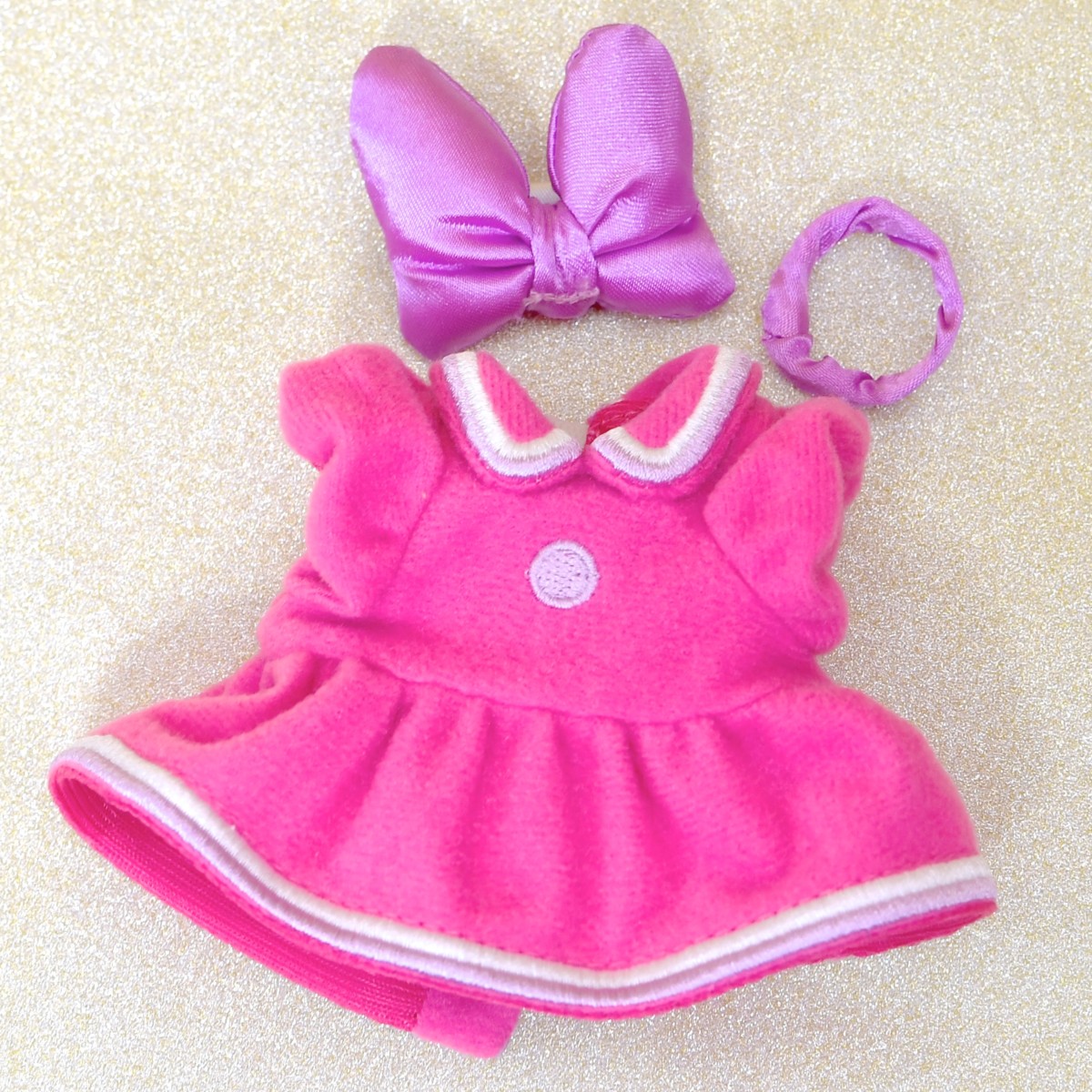 ピンクのワンピース、紫のリボン、ブレスレットがおしゃれなデイジーダック☆
