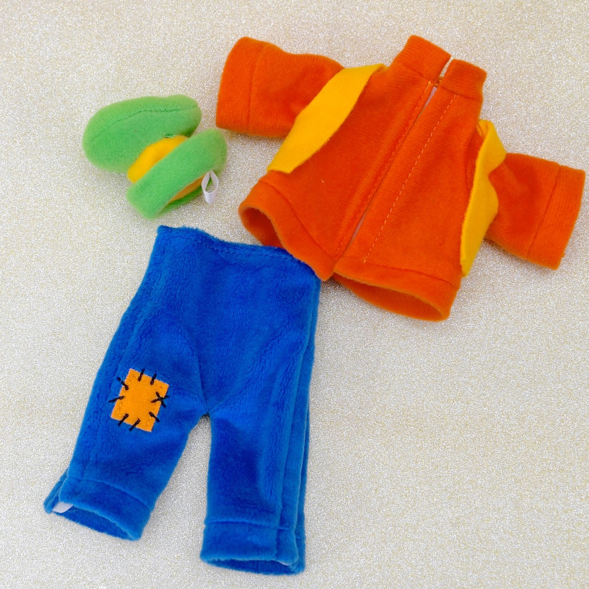 グリーンの帽子、オレンジ、黒、青色の定番コスチューム。