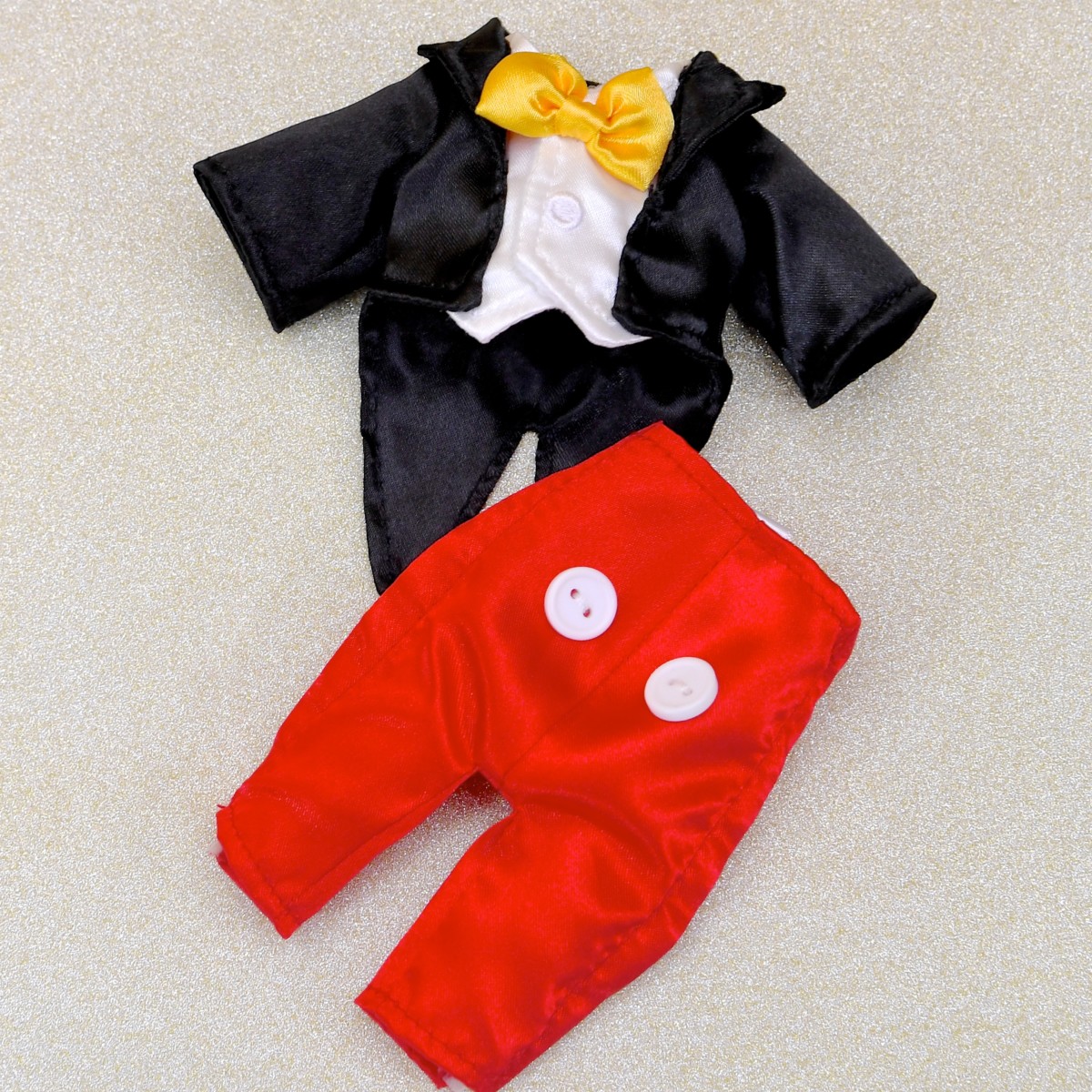 黒い燕尾服と赤いパンツ、黄色の蝶ネクタイを身につけています。