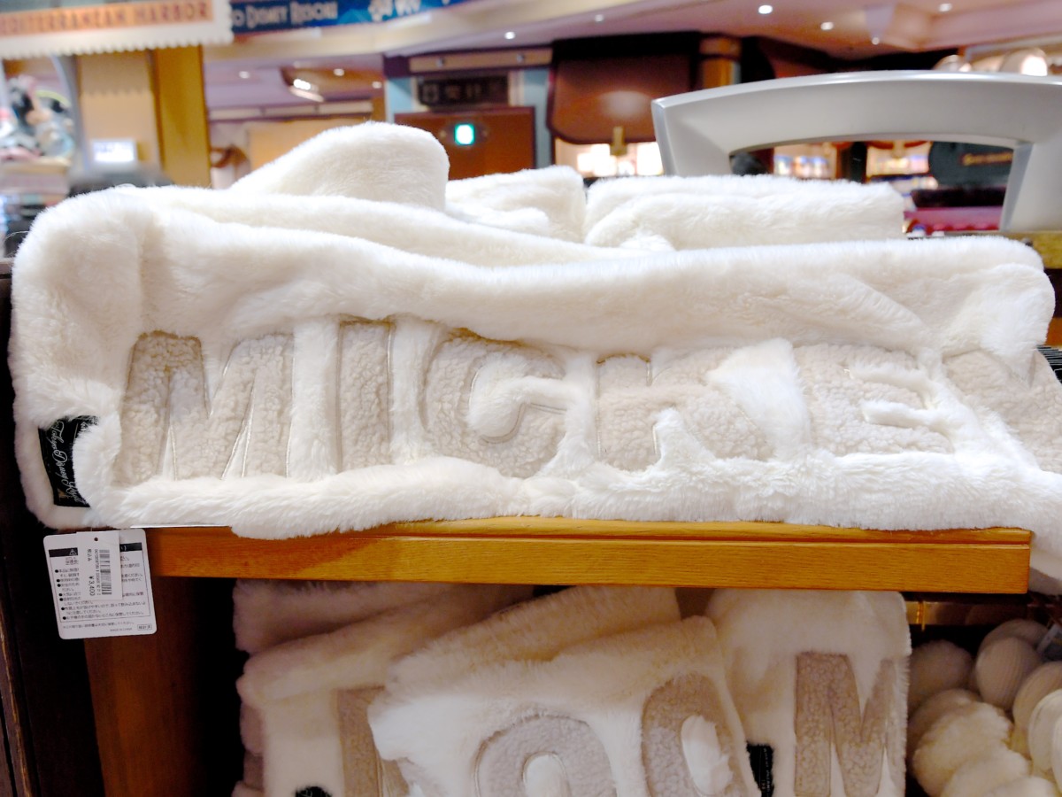 MICKEY MOUSEの名前が前面に入ったふわふわマフラー。