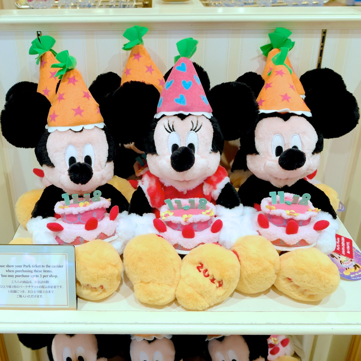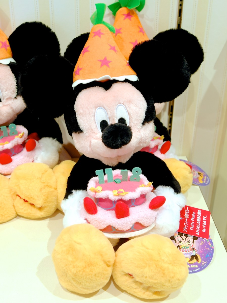 11月18日がデコレーションされたお誕生日ケーキをもったミッキーのぬいぐるみ。