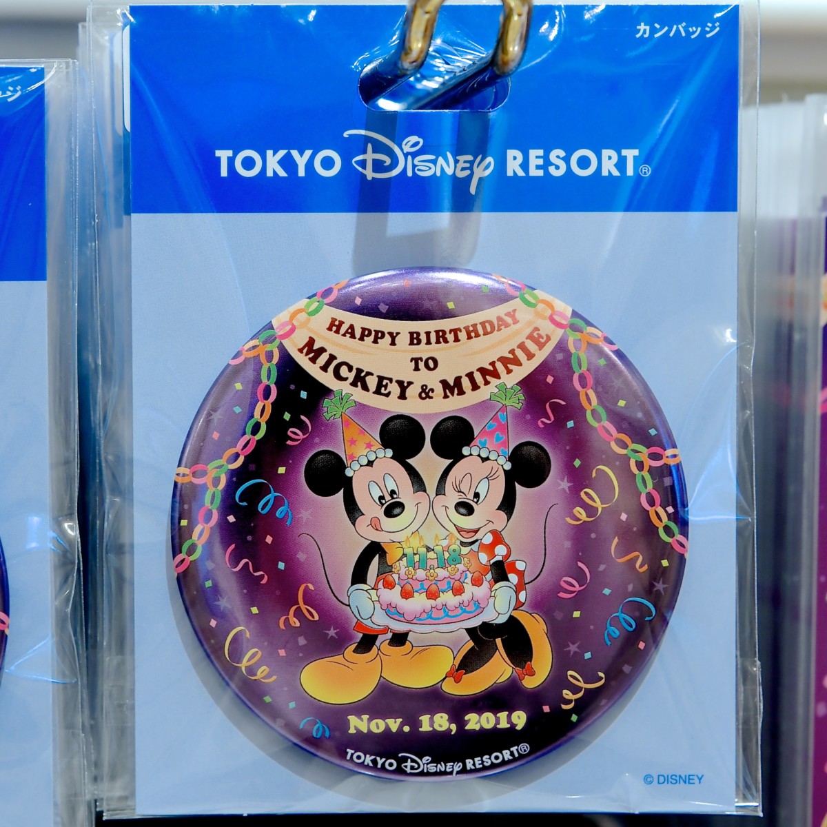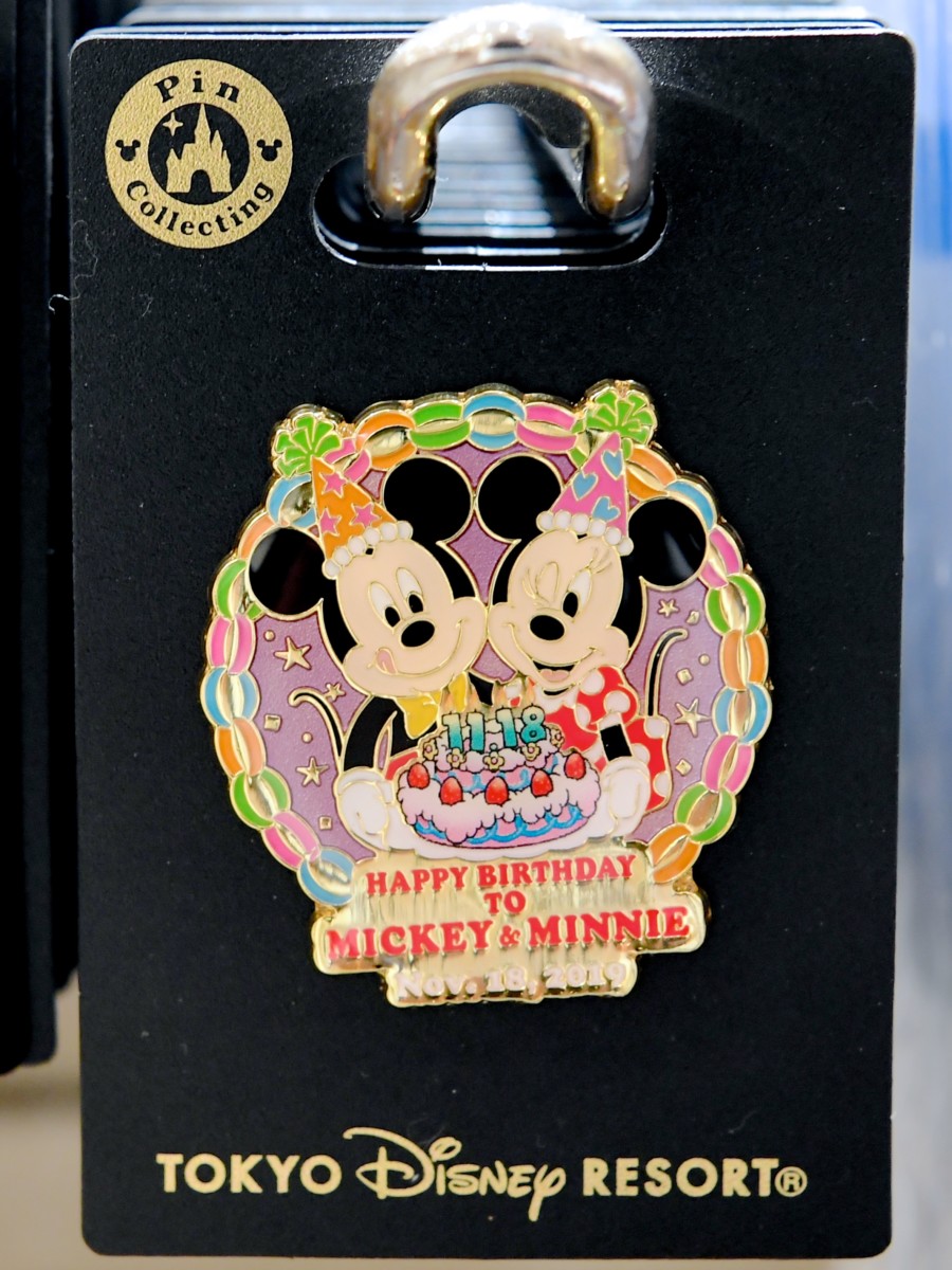 お誕生日ケーキを一緒に持った仲良しなミッキー、ミニーのぬいぐるみバッジセット。