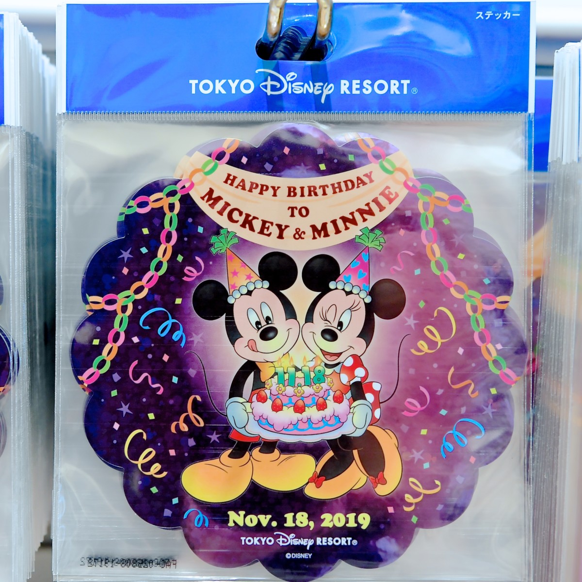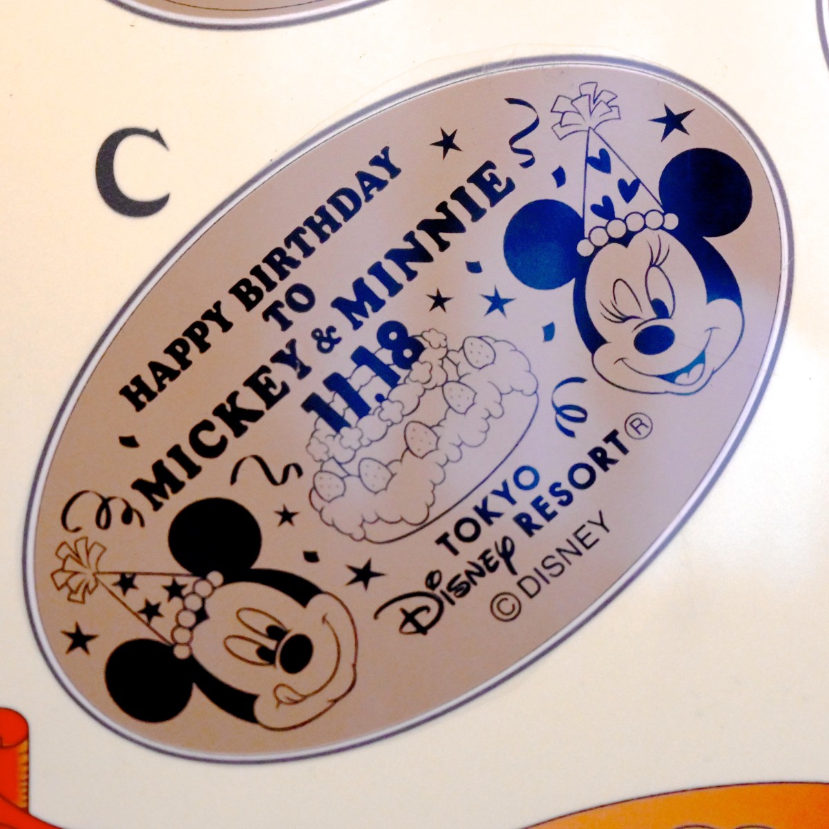 お誕生日をお祝いするミッキー、ミニーがデザインされたスーベニアメダル。