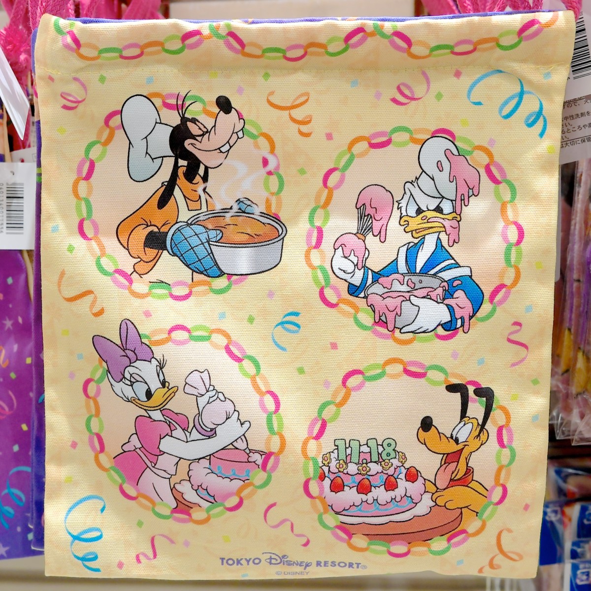 バックは、ミッキーとミニーのお誕生日ケーキをつくるドナルド、デイジー、グーフィーとプルート。
