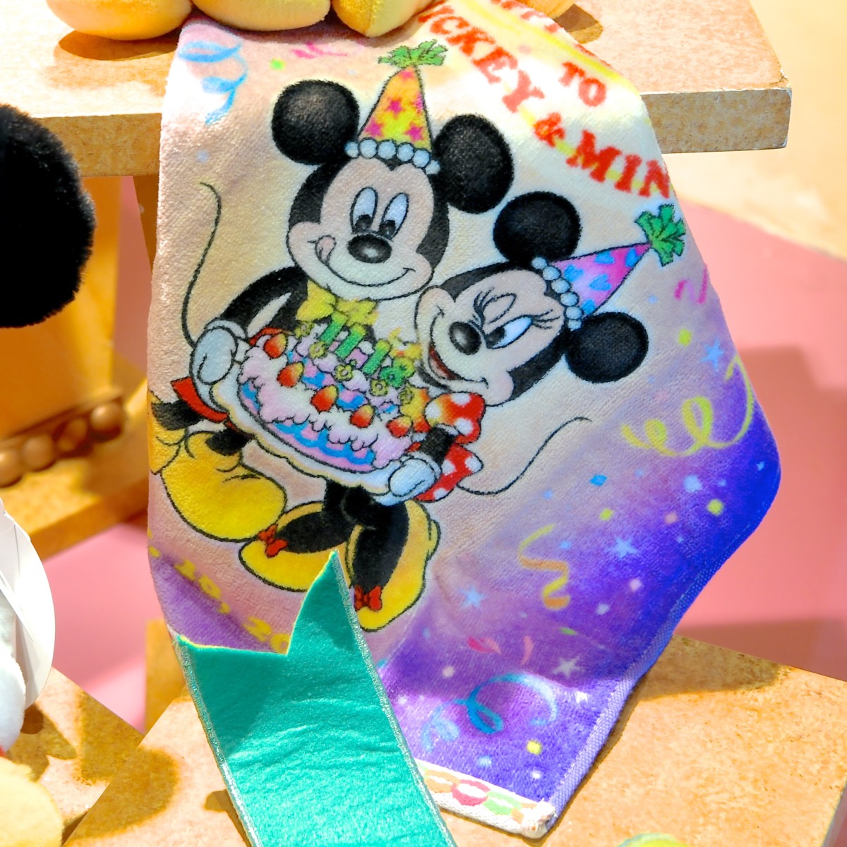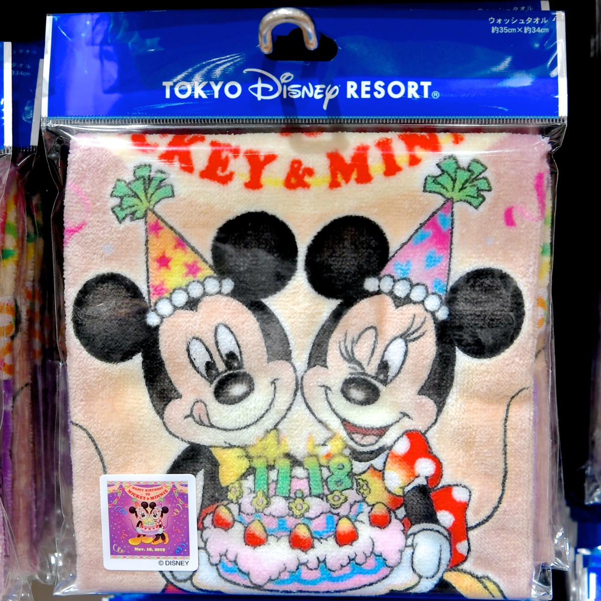ケーキでお祝いしているミッキーマウスとミニーマウスがデザインされたウォッシュタオル。