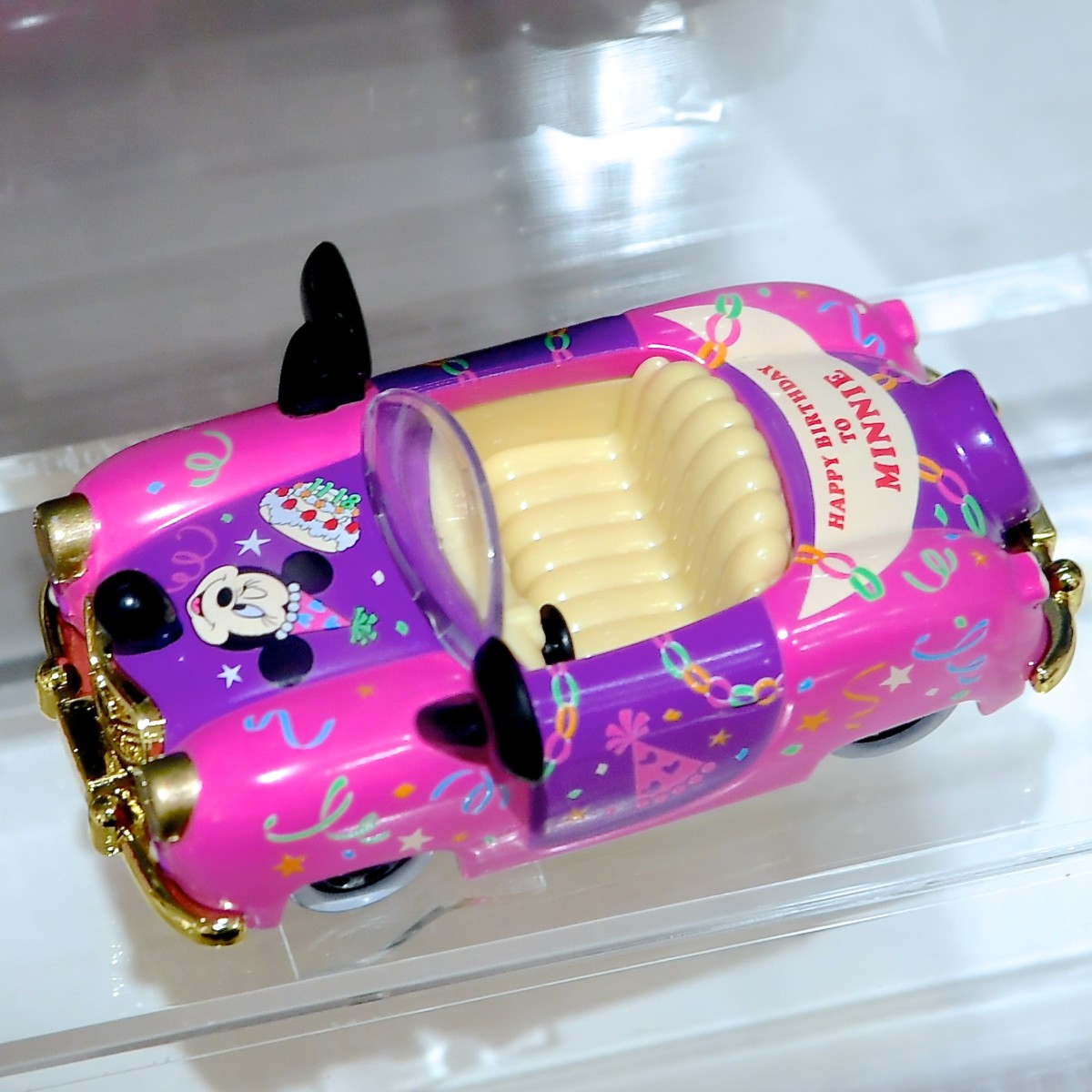 ボンネット部分にはウインクをした「ミニーマウス」とケーキがデザインされています。