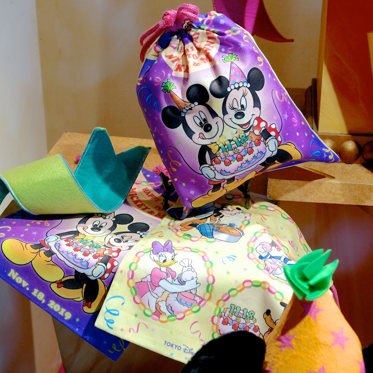 お誕生日ケーキを持ったミッキー、ミニー、デコレーションがかわいい巾着。